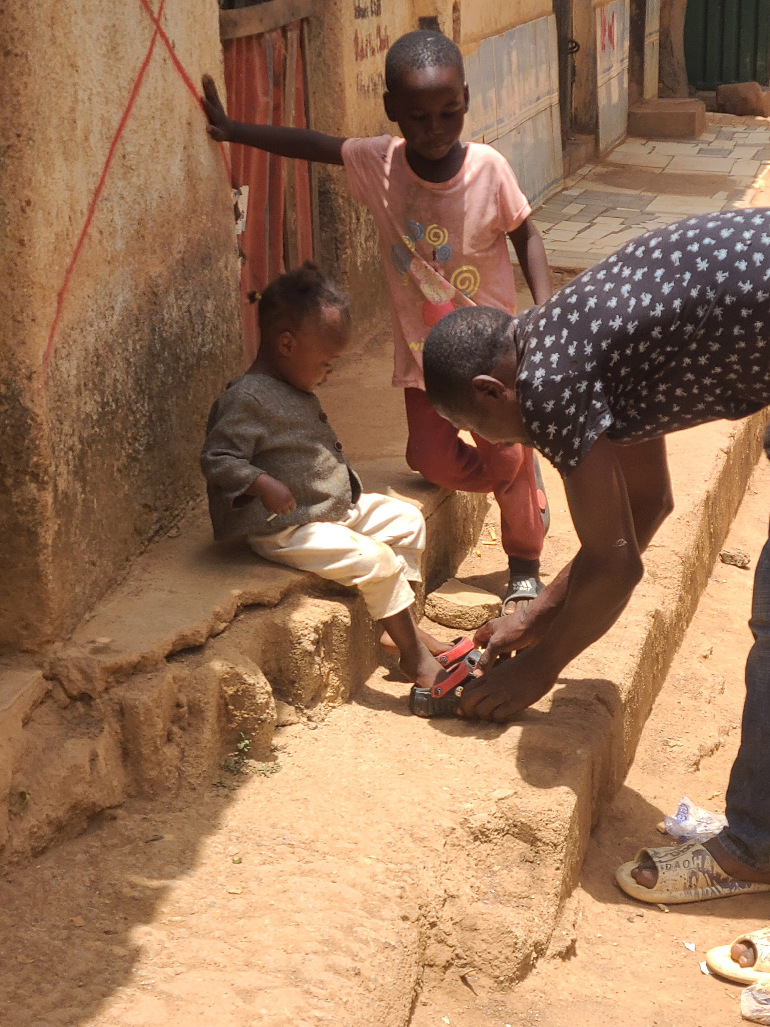 The image captures a scene in what appears to be a residential area of Jos, Nigeria. Three individuals are visible. A child wearing a pink shirt is in a handstand position, balancing with one hand on…read more