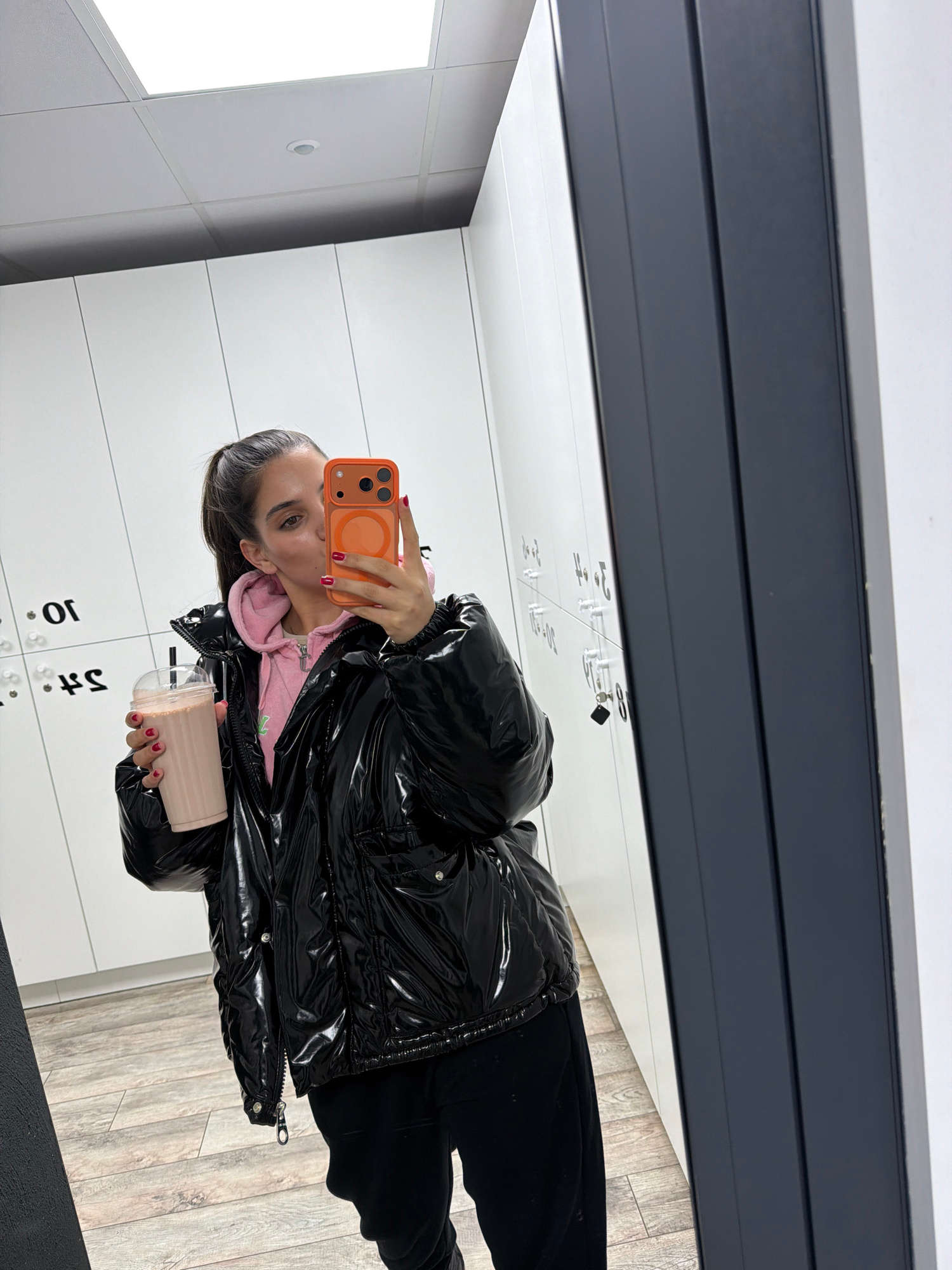 A woman stands in front of a wall of lockers, taking a selfie in a mirror. She is holding an orange phone in one hand and a pink drink in a plastic cup with a straw in the other. She is wearing a shin…read more
