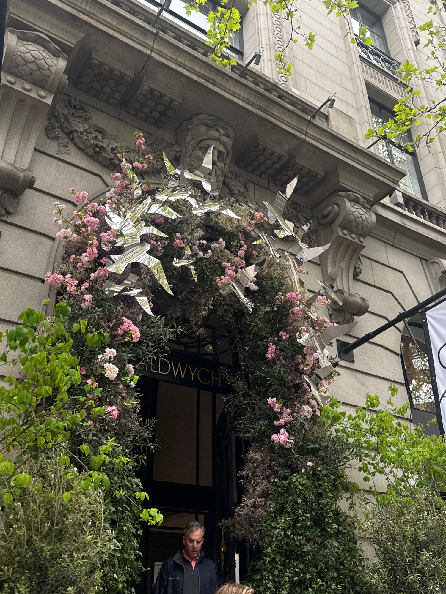 The photograph shows an exterior architectural detail in London, United Kingdom, likely at the Aldwych Theatre entrance. The building has an ornate facade, featuring carved details and mouldings. A fl…read more