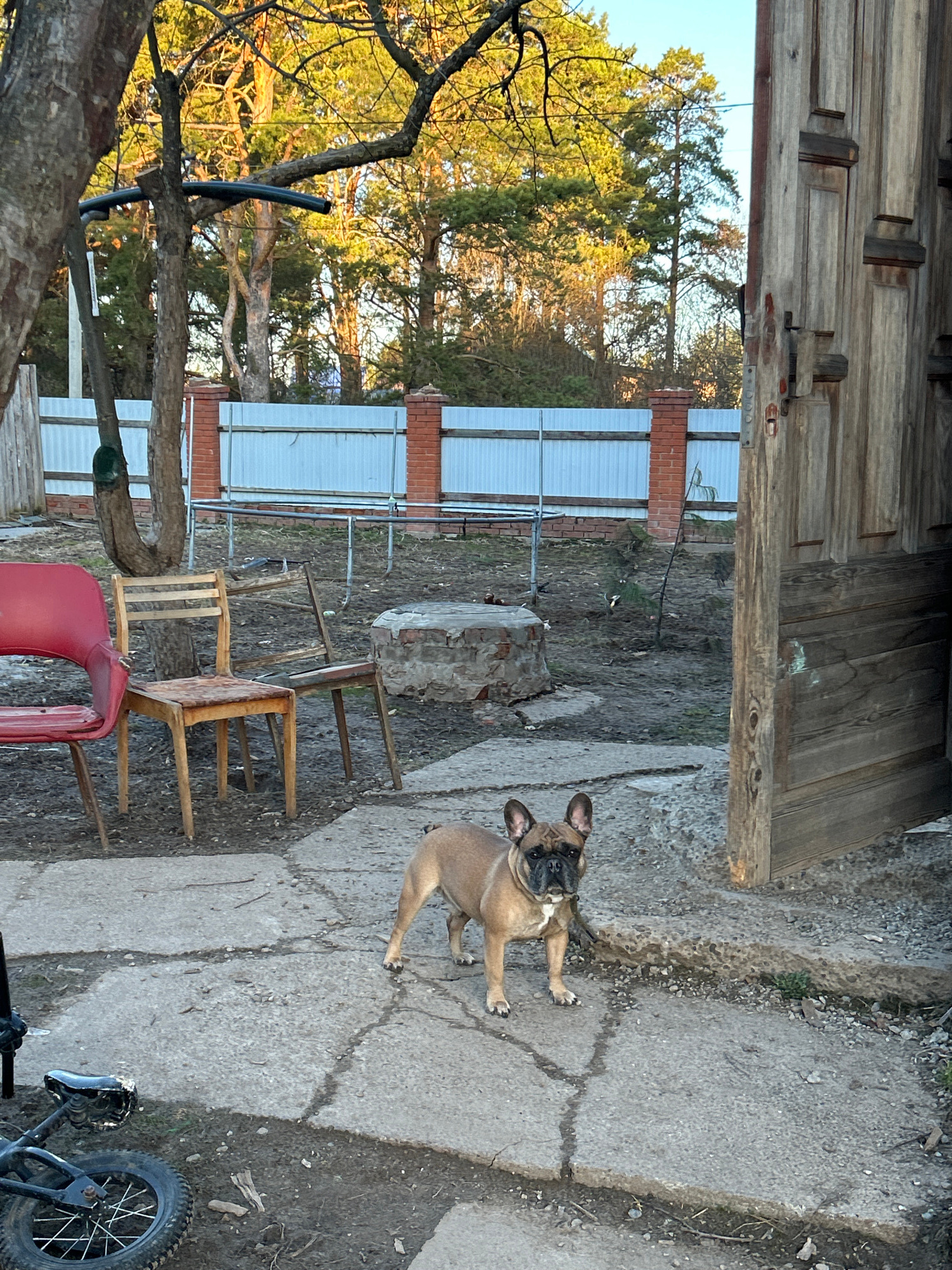 The image shows a tan French bulldog standing on a concrete slab next to a wooden structure in Rusalevka, Russia. Several wooden chairs are scattered on the ground, and a bicycle is partially visible…read more