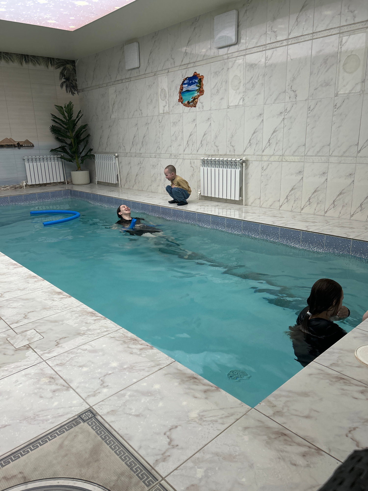 The image depicts the interior of what appears to be a private indoor swimming pool area, possibly located in a residence or a private club. The image was taken in a location with tiled floors and poo…read more