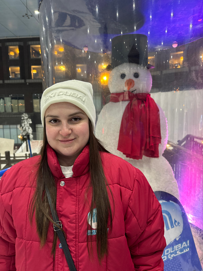 This portrait-oriented image captures a young woman posing in what appears to be an indoor winter-themed attraction. The main subject, a young woman, occupies the left side of the frame, smiling sligh…read more