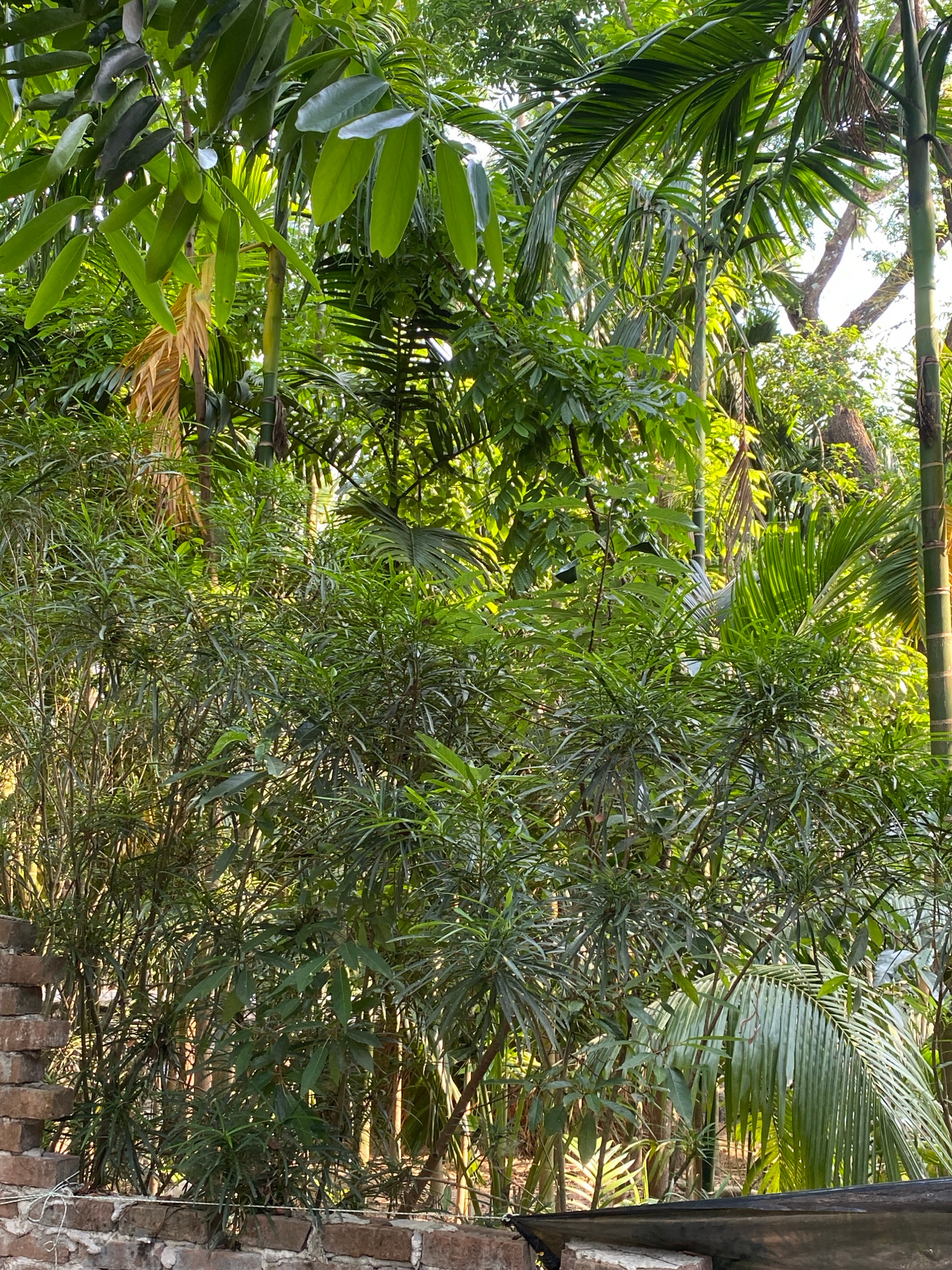 The image shows a dense cluster of vegetation, including palm trees and bamboo, against a partly visible brick wall. The location is inferred to be in an urban setting in Unknown, Bangladesh, based on…read more