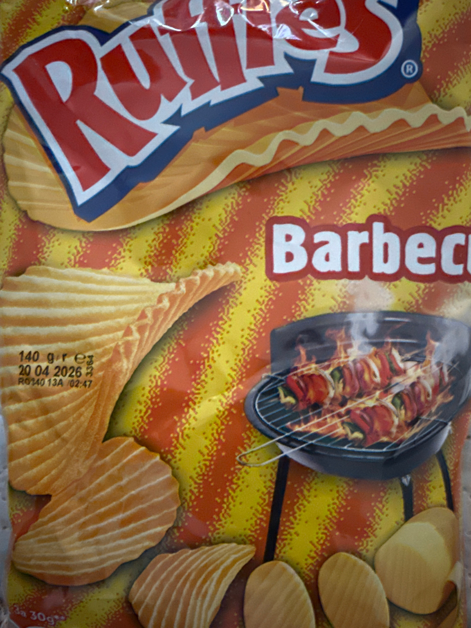 A forensic, matter-of-fact description of the image: The image is a close-up shot of a bag of "Ruffles" brand potato chips, barbecue flavor. The package is predominantly yellow and orange, with a sty…read more