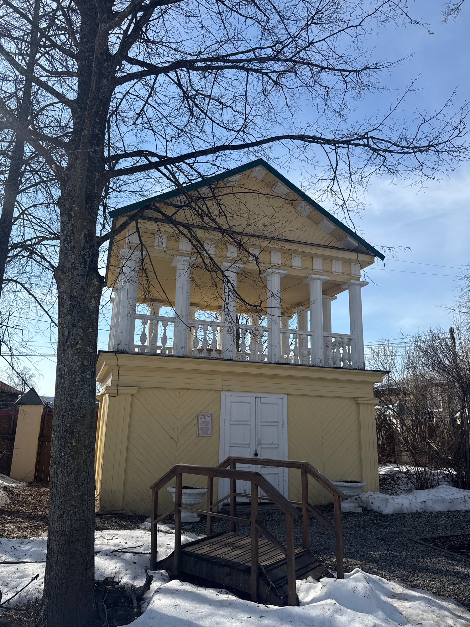 The image shows a two-story yellow wooden house in Votkinsk, Russia. The house has a green roof and white decorative trim around the windows and balconies. A wooden staircase leads to a porch. Patches…read more