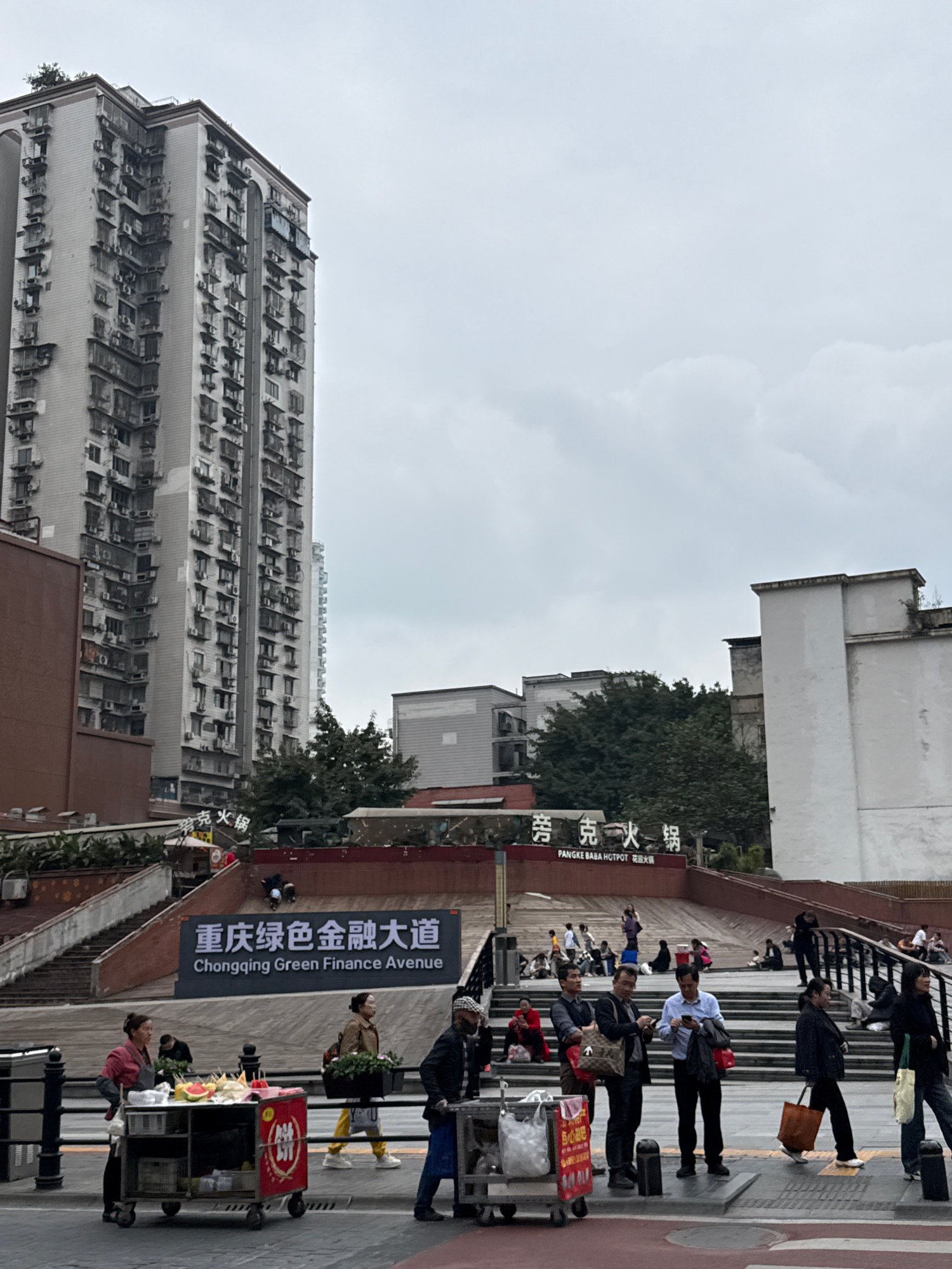 Here is a description of the image: The photograph depicts a street scene in Yuzhong District, Chongqing, China. A tall, high-rise apartment building dominates the left side of the image. Many indivi…read more