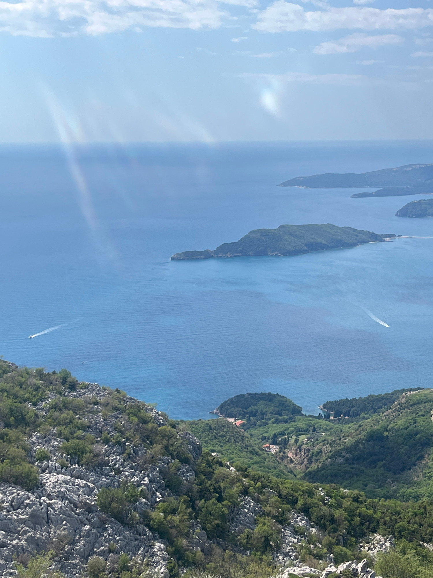 The image captures a scenic view from a high vantage point near Boreti, Montenegro. The scene shows several islands stretching into the Adriatic Sea. Turquoise water surrounds the islands. The shoreliβ¦read more