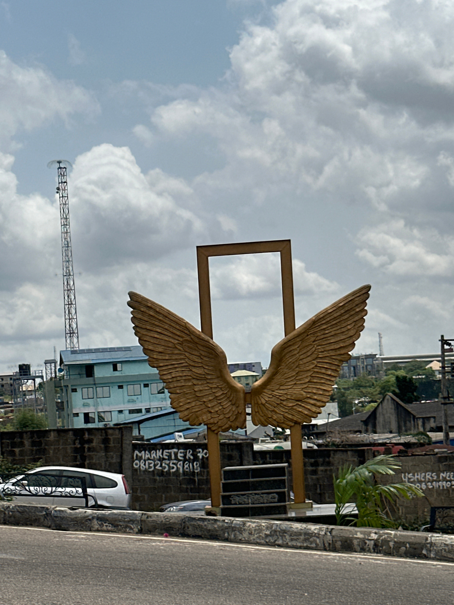 A photograph captures a sculpture in Ikeja, Nigeria, featuring a pair of golden wings within a rectangular frame. The sculpture is set against a backdrop of buildings and a cloudy sky. A communication…read more