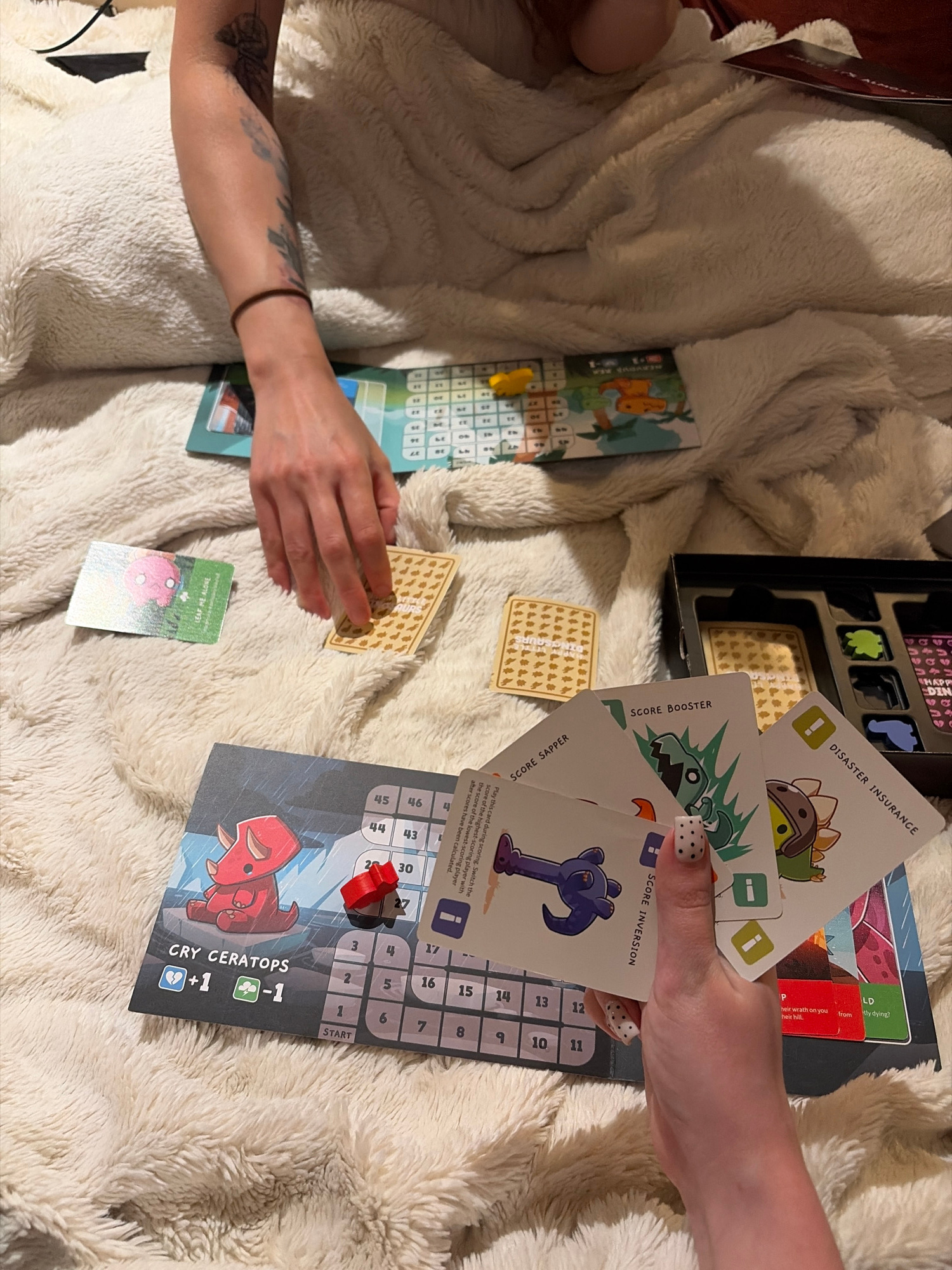 Two people are engaged in playing a board game, which is spread out on a soft, light-colored plush blanket. The scene appears to be indoors, likely in the evening given the artificial lighting. One p…read more