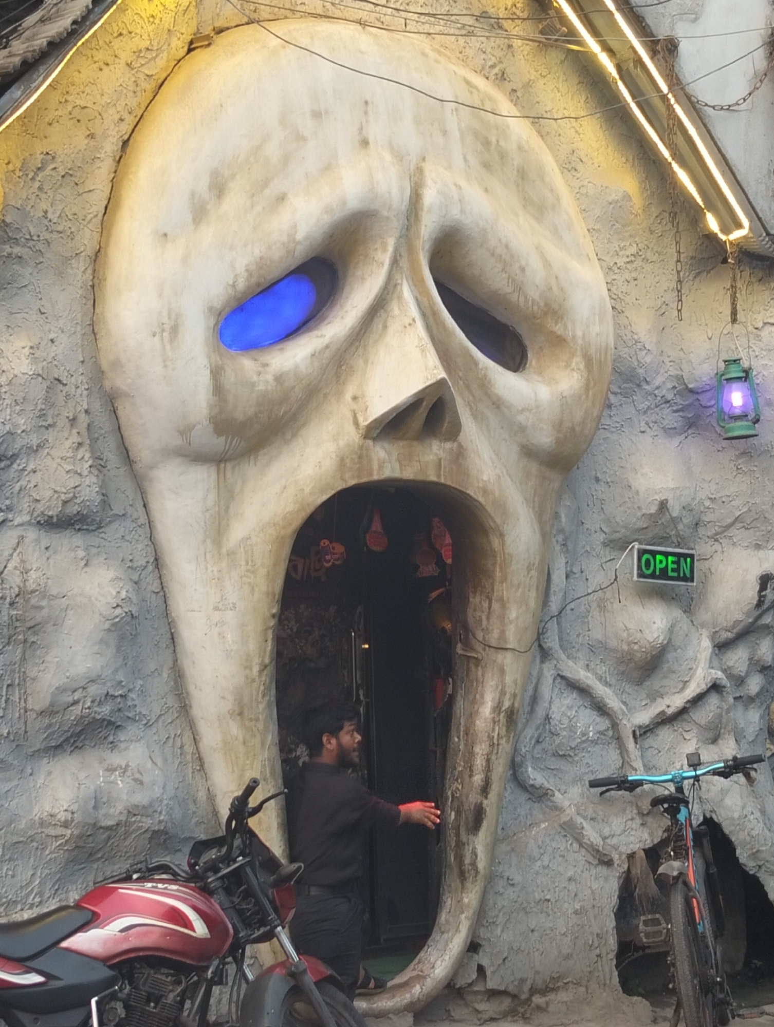 A large skull-shaped entrance, possibly to a haunted house or themed attraction, dominates the frame. The skull's eyes are illuminated with blue light, and its open mouth serves as the doorway. A man…read more