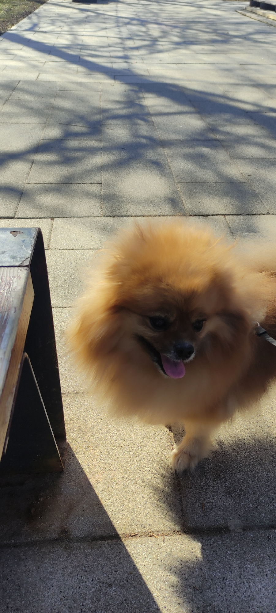 A tan Pomeranian dog with its tongue out stands on a paved surface. The dog is near the corner of a dark metal object that has a wooden top. The pavement is made of light-colored square tiles. The sha…read more