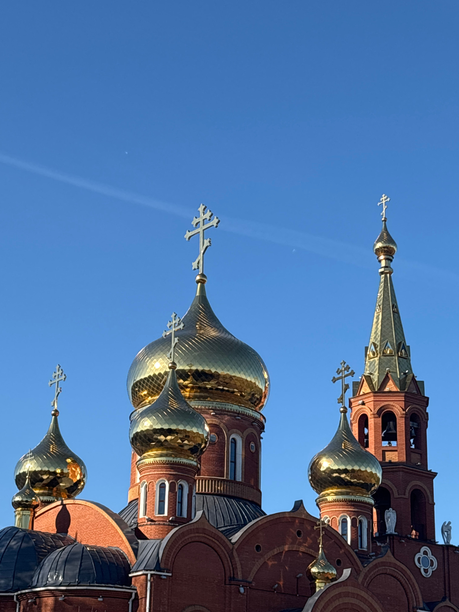 The image shows a close-up view of the golden domes and spires of the Holy Great Martyr George Cathedral in Chaikovsky, Russia, against a clear blue sky. The cathedral's brick structure is visible, fe…read more