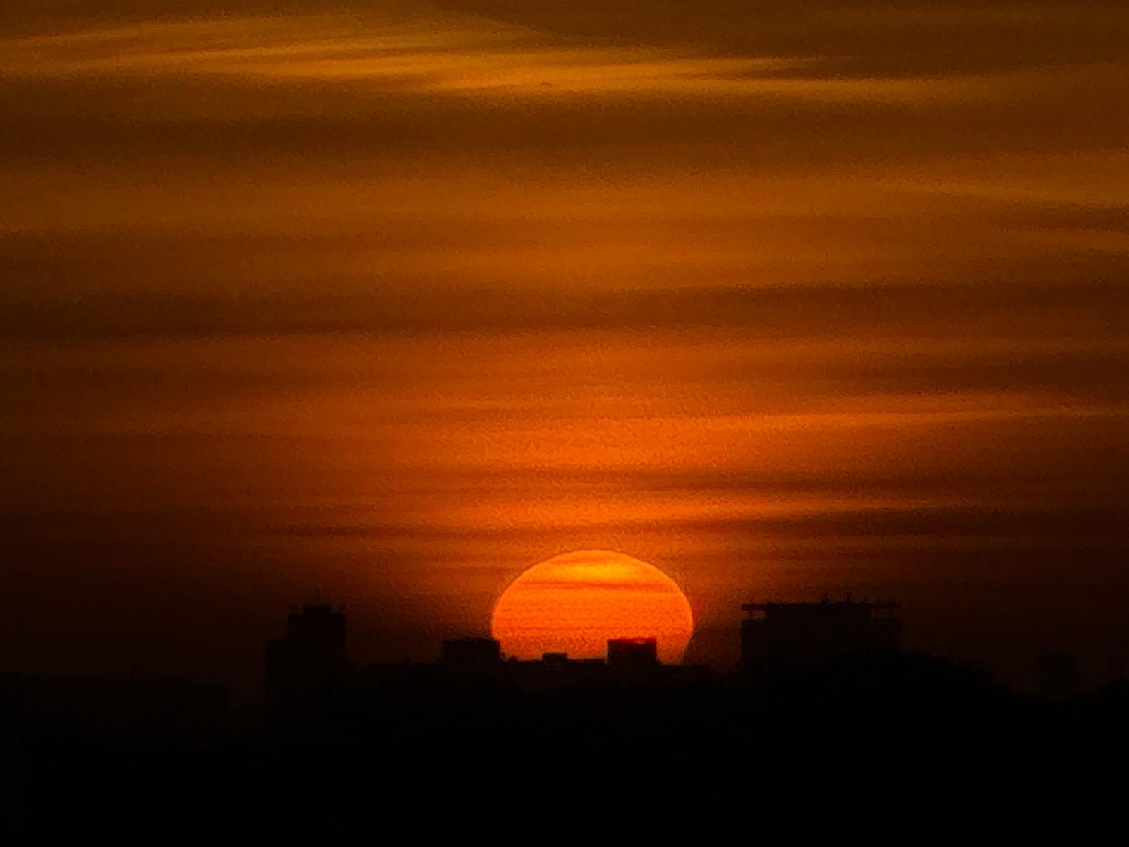 An image captures a dramatic sunset or sunrise over a silhouetted skyline, likely in Maasdijk, Netherlands, given the provided context. The dominant feature is a large, vibrant orange-red sun, partialβ¦read more