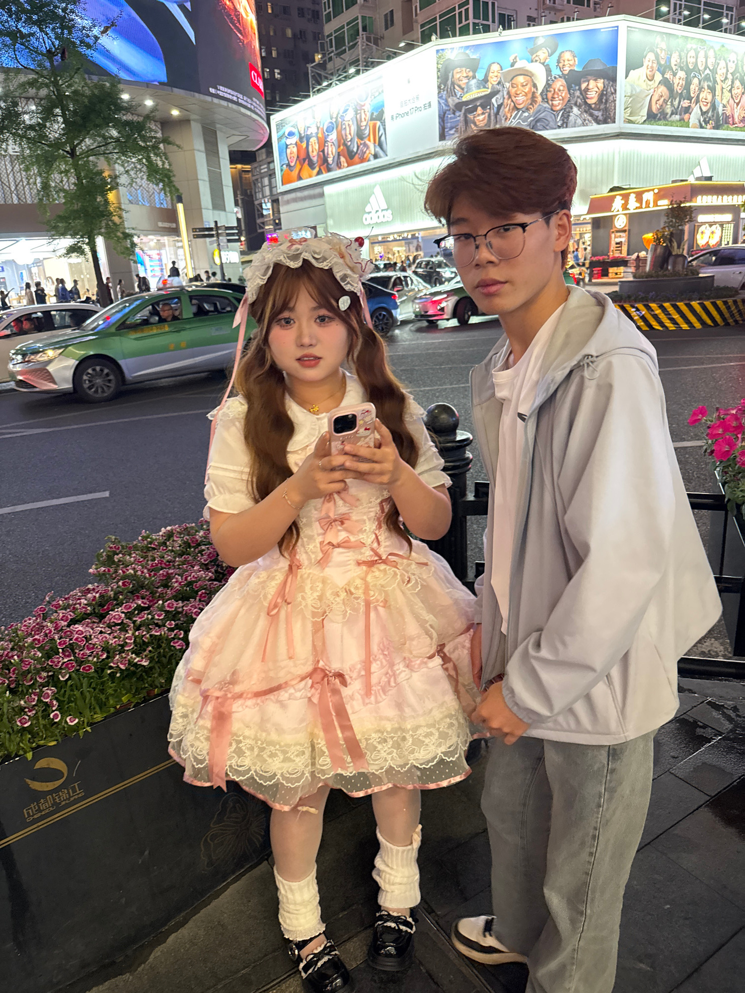 A young adult couple is photographed on a street in Jinjiang District, China, at night. The woman wears a light pink, frilly dress with white knee-high socks and black shoes. She is holding a smartpho…read more