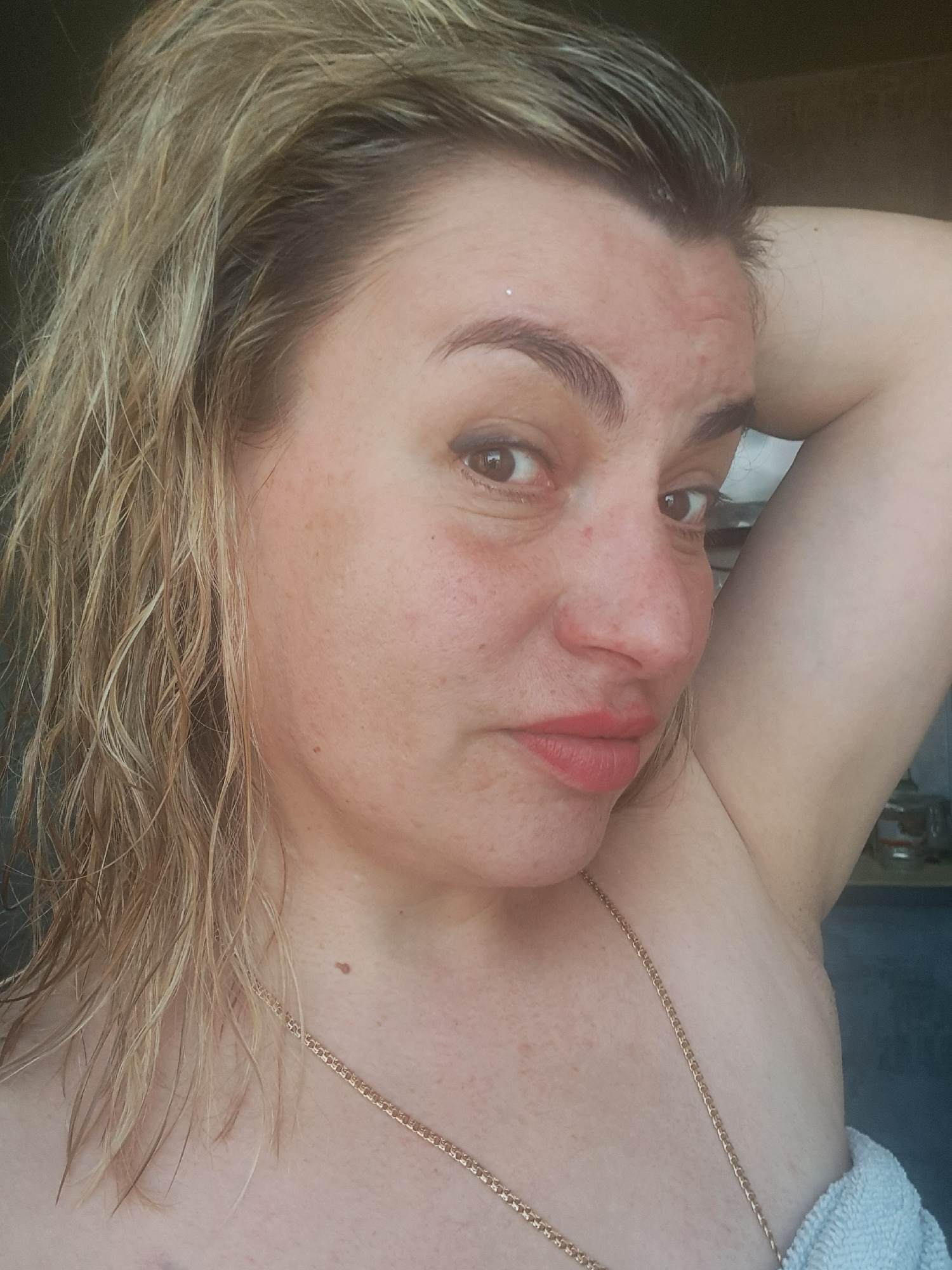 A medium shot, rotated counter-clockwise, shows a middle-aged Caucasian woman with blonde hair. Her hair appears wet. The woman is reclining, with one arm raised behind her head. She is wearing a thin…read more