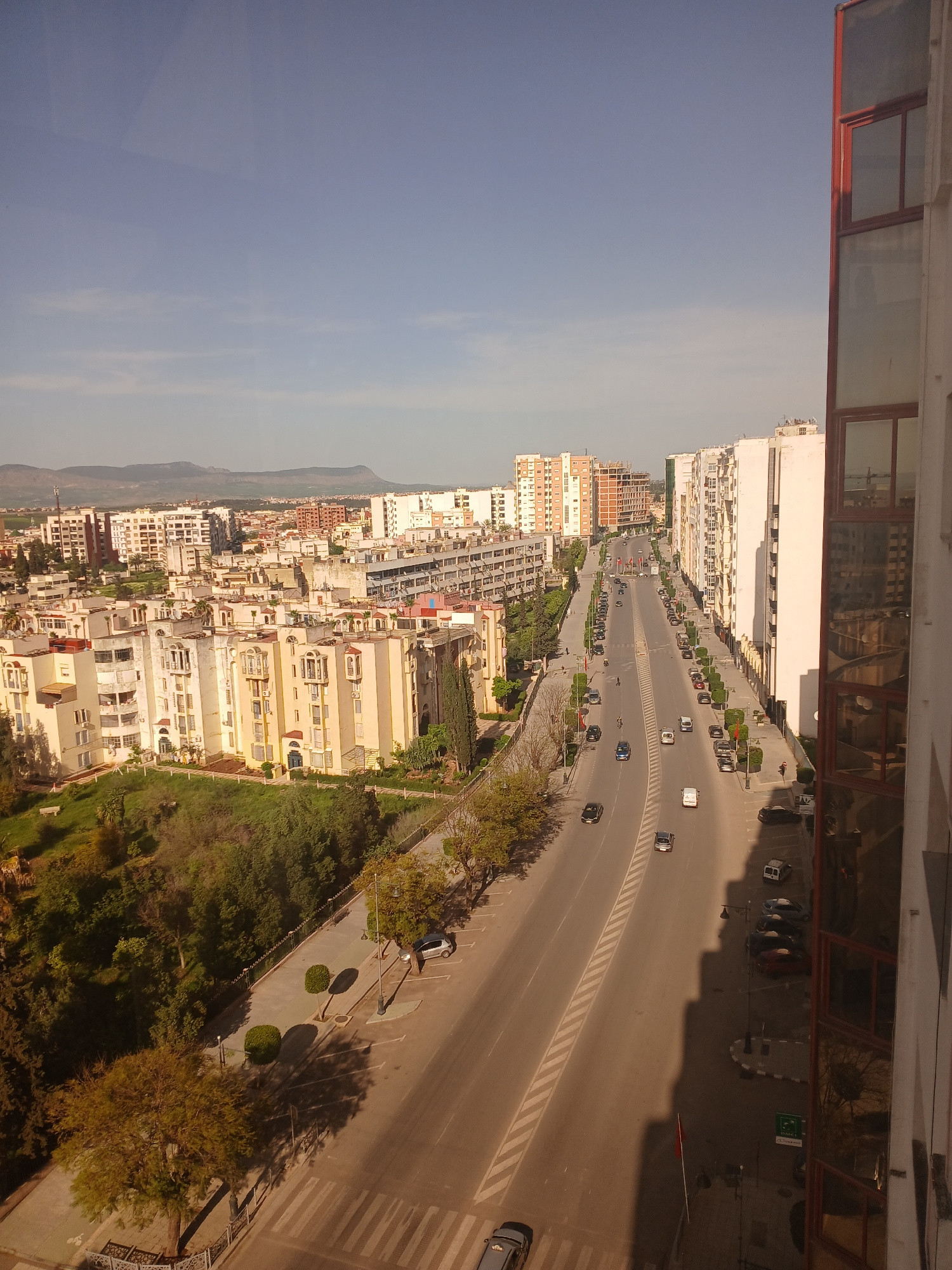 This image shows an aerial view of Meknes, Morocco. The photo is oriented with the sky on the left and the city on the right. A large avenue runs through the middle of the frame, with multiple lanes o…read more