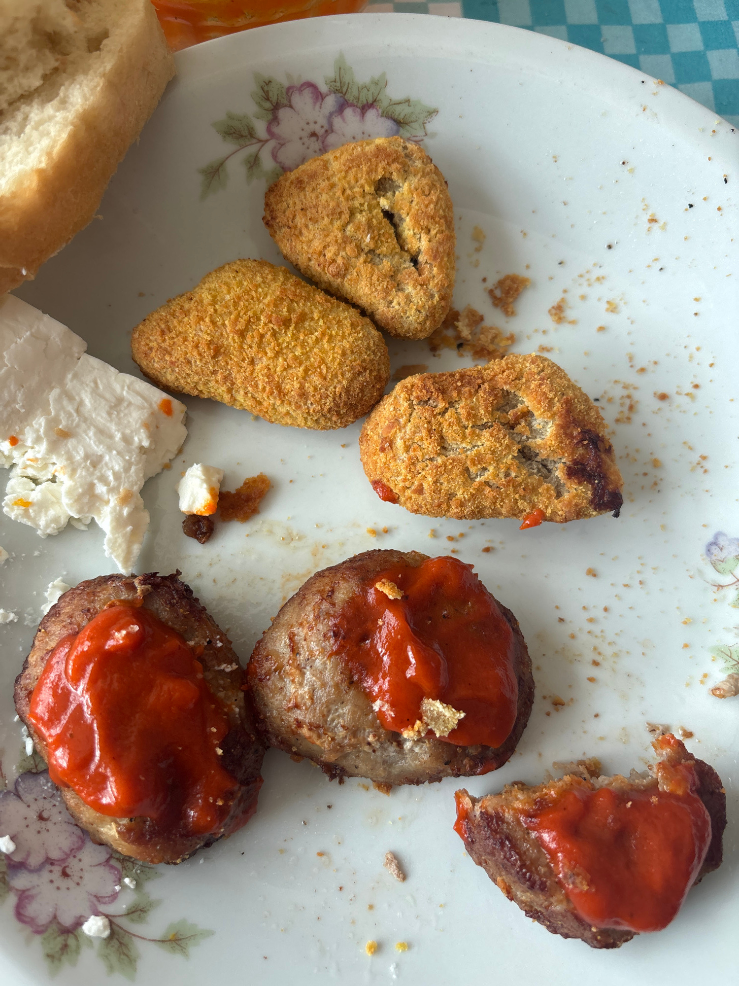 A plate containing food is shown on a table with a blue and white checkered tablecloth. The plate has a floral pattern around the rim. On the plate, there are three breaded, fried food items that appe…read more