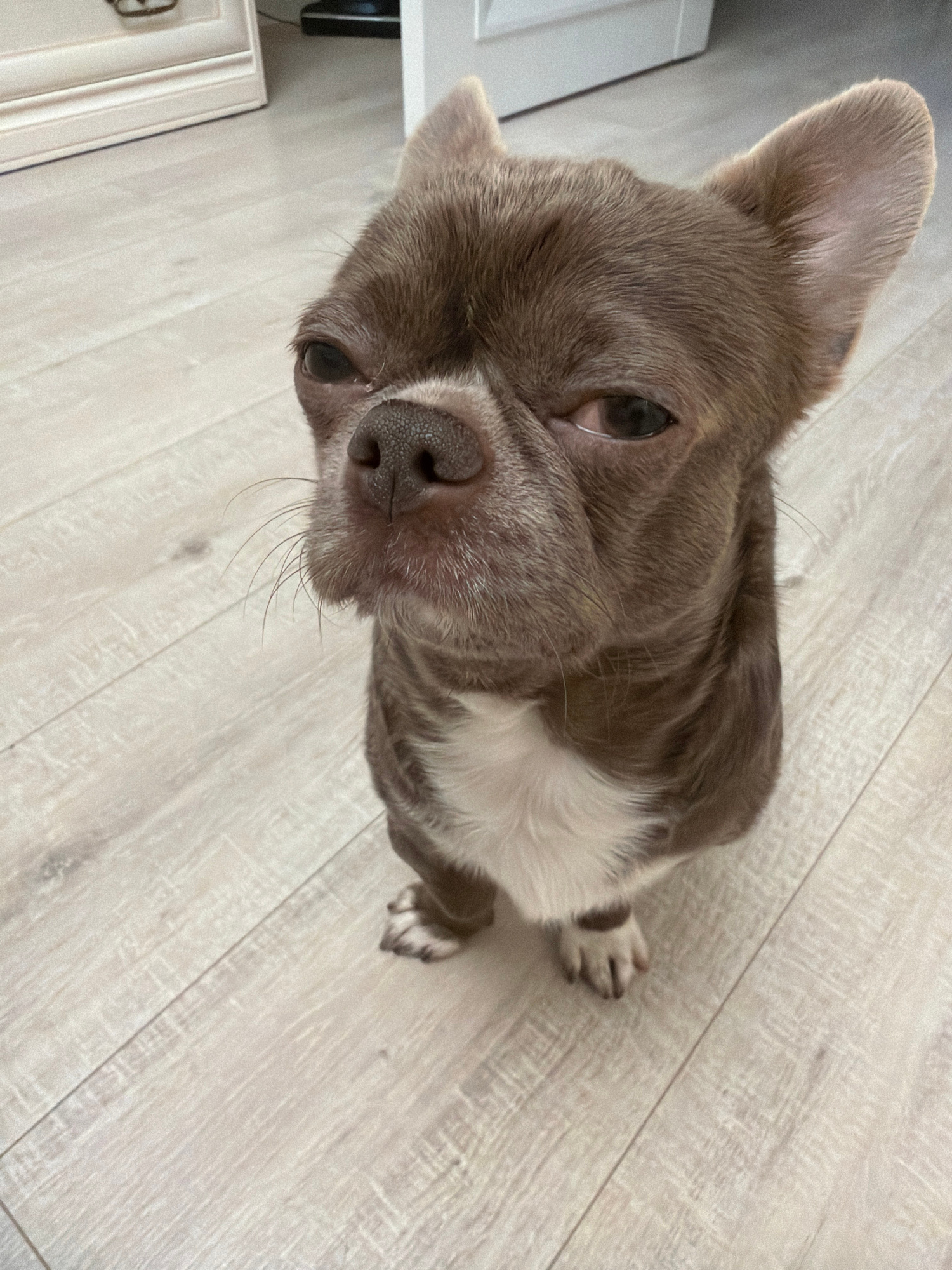 A close-up, high-angle shot of a short-haired, brown and white dog, possibly a French Bulldog, sitting on a light wood-grain floor. The dog is looking up at the camera, with a slightly tilted head. Th…read more