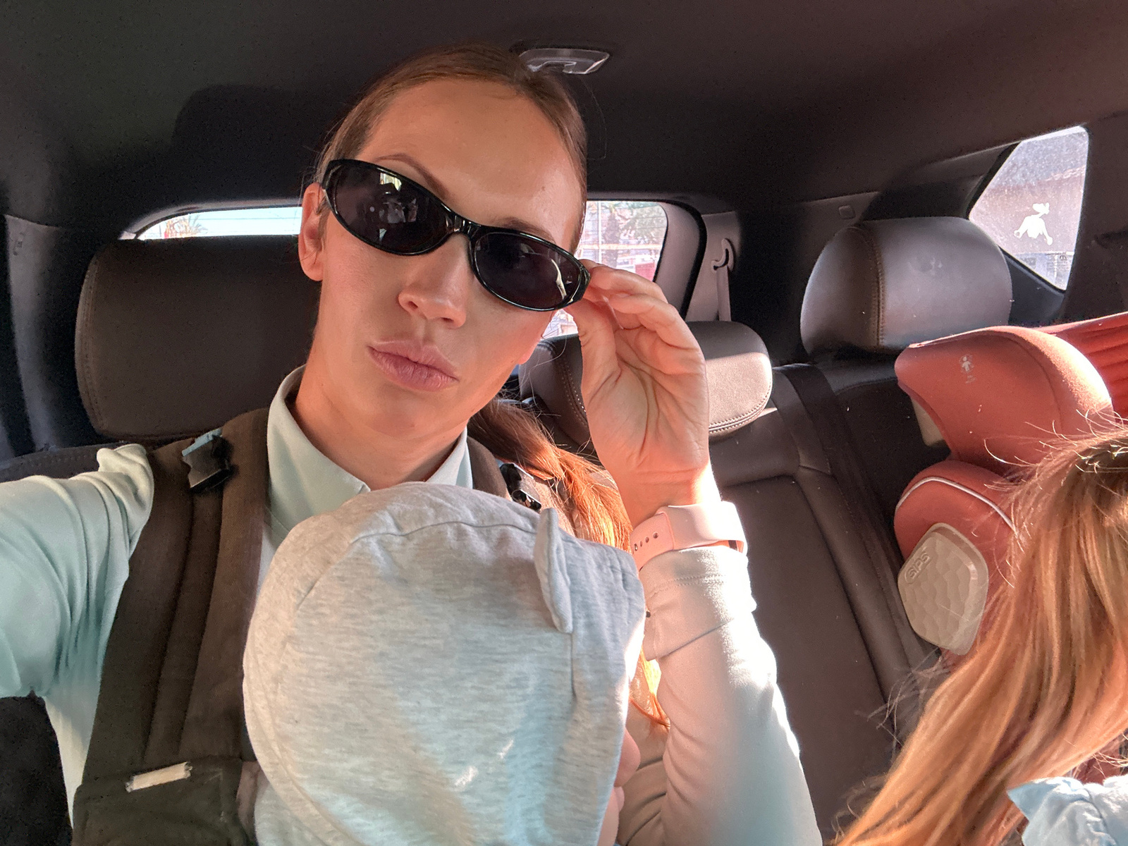A woman wearing sunglasses, a light blue shirt, and a gray hooded vest is inside a car. A child's car seat is visible behind her. The woman is holding her sunglasses with her right hand. Outside the c…read more