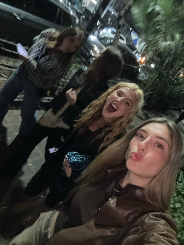 Four young women pose for a selfie outdoors at night. One with long brown hair pouts for the camera, wearing a brown jacket. Beside her, a blonde woman smiles widely, wearing a black jacket and carryi…read more