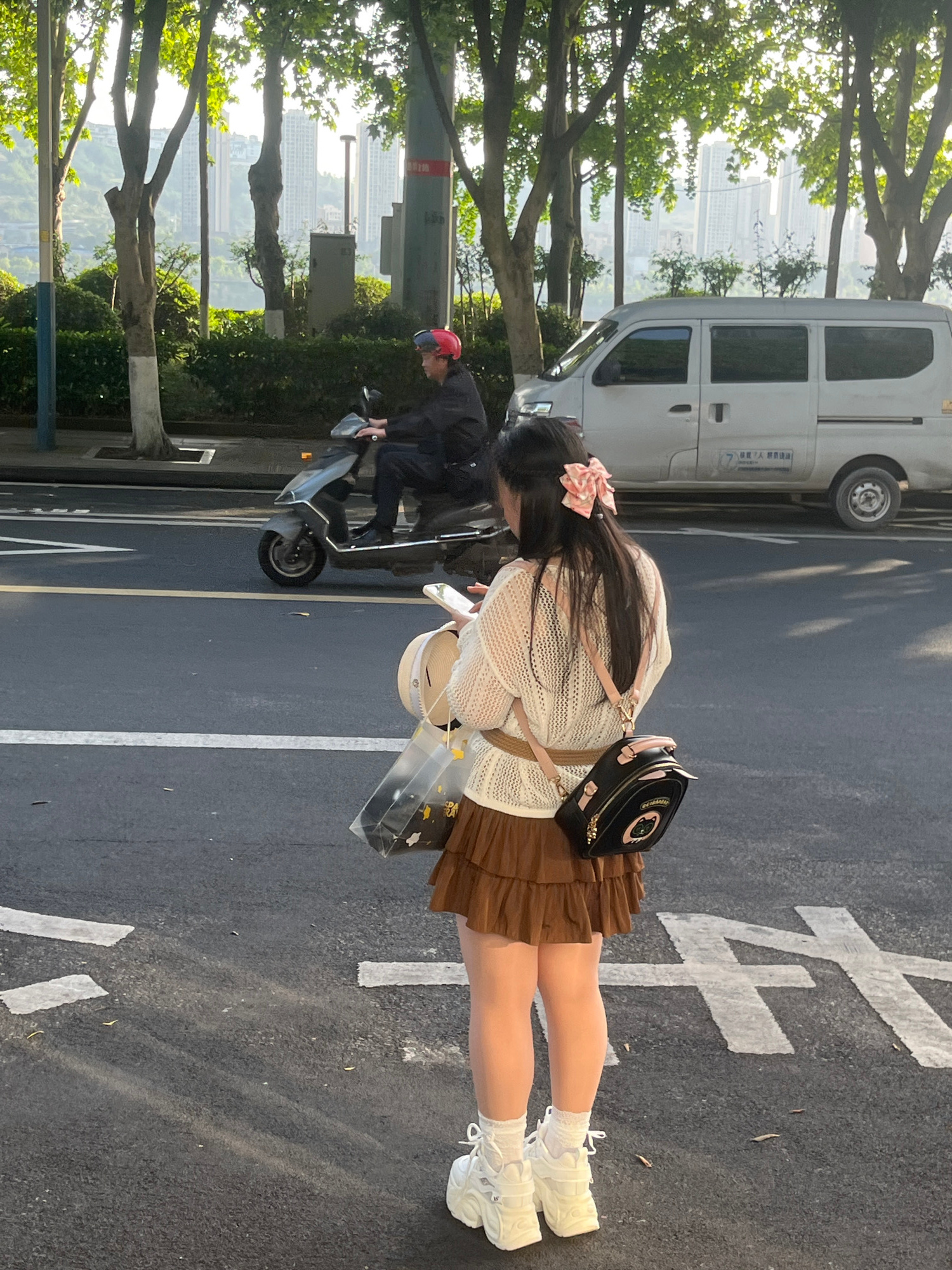 The image depicts a vibrant street scene on a sunny day in an urban area of Jiangjin, China. The primary subject is a young woman, seen from the back and left side, standing on a paved road. She has l…read more
