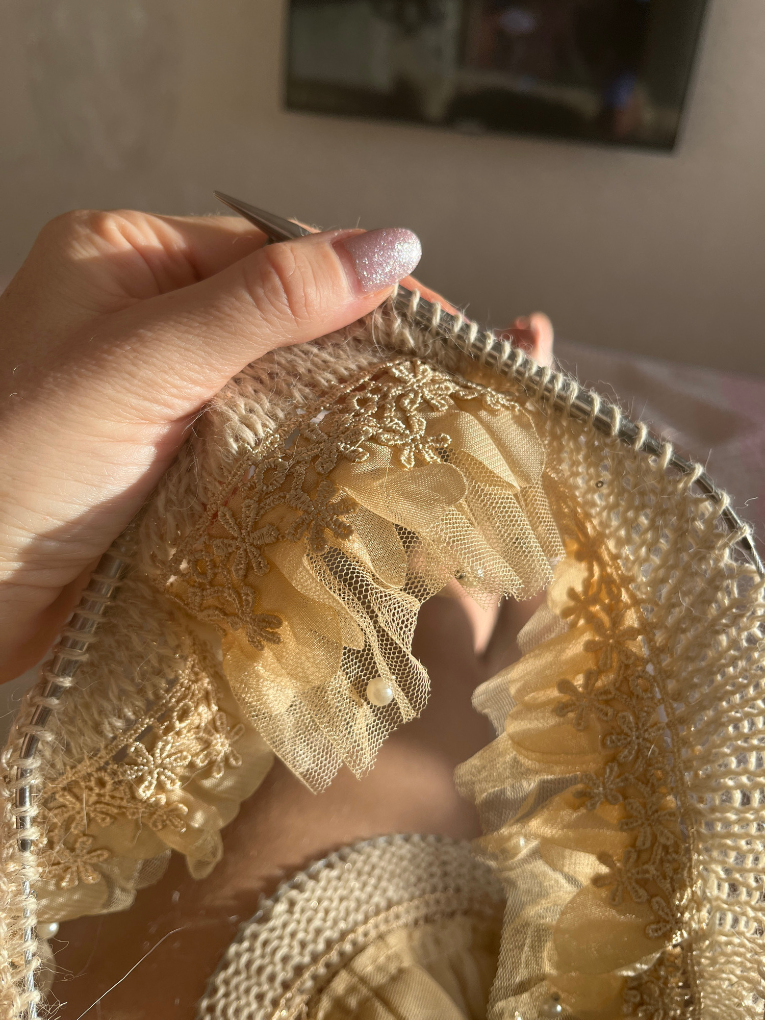 A person is holding knitting needles and a beige knitted fabric adorned with lace and pearls. The fabric is being worked on a circular knitting needle. The person's hand is visible, featuring a glitte…read more