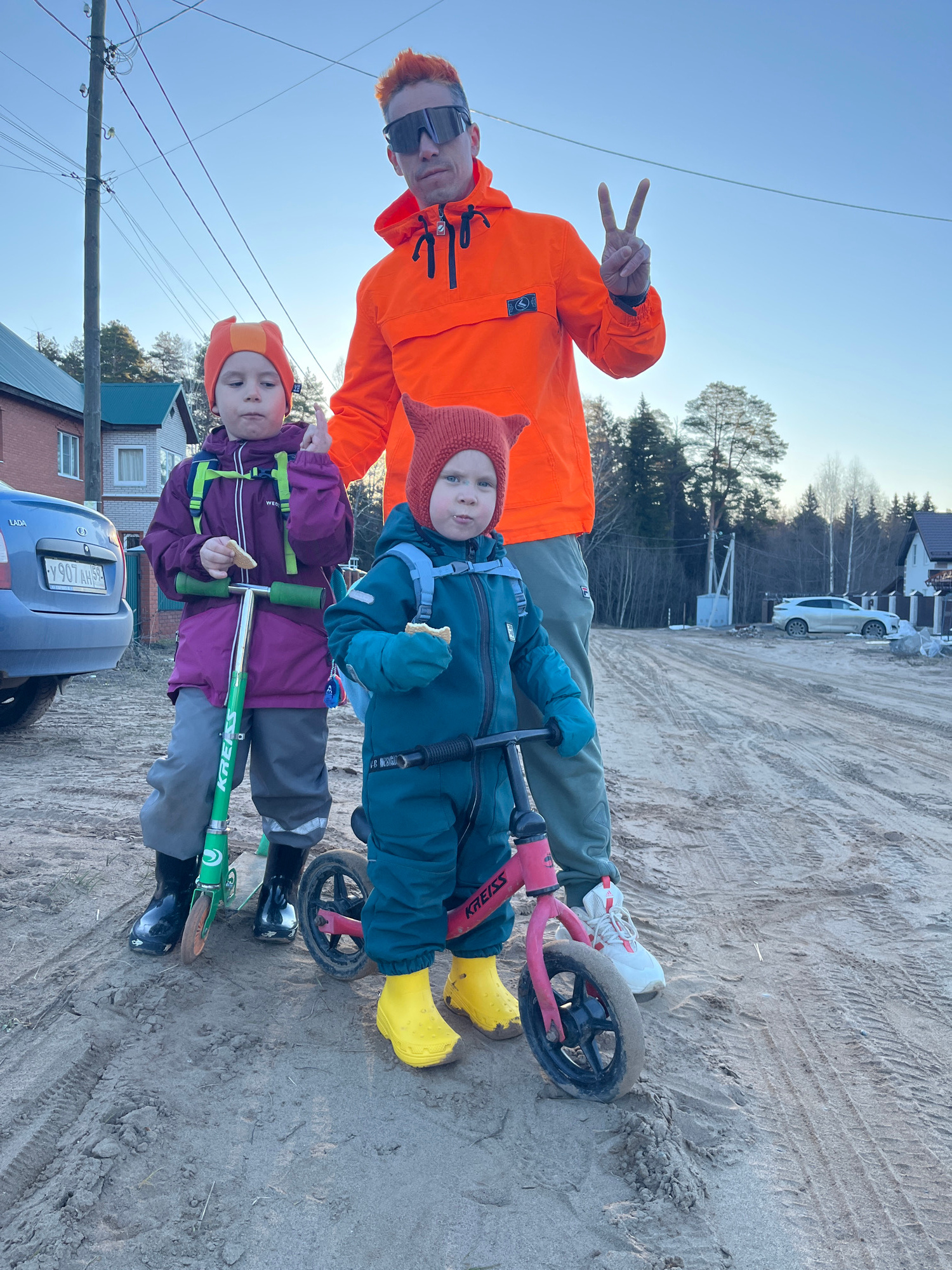 The image shows a man and two young children outdoors. The man, wearing an orange jacket and sunglasses, is making a peace sign. One child, wearing a blue jumpsuit and yellow boots, stands next to him…read more
