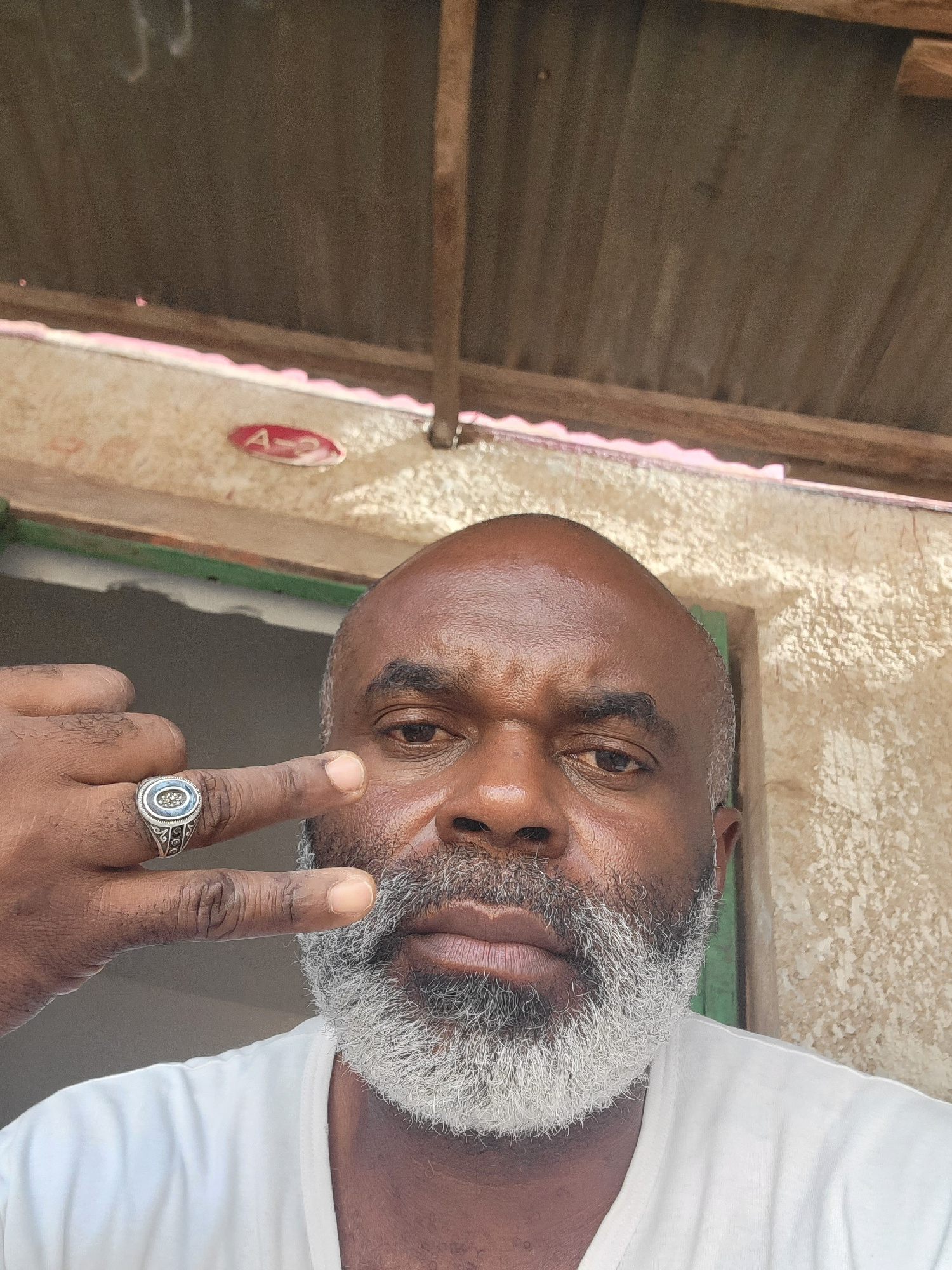 An upward-facing, medium close-up portrait shot features an adult Black man with a bald head and a full, salt-and-pepper grey beard and mustache. He is wearing a white t-shirt. His right hand is raise…read more