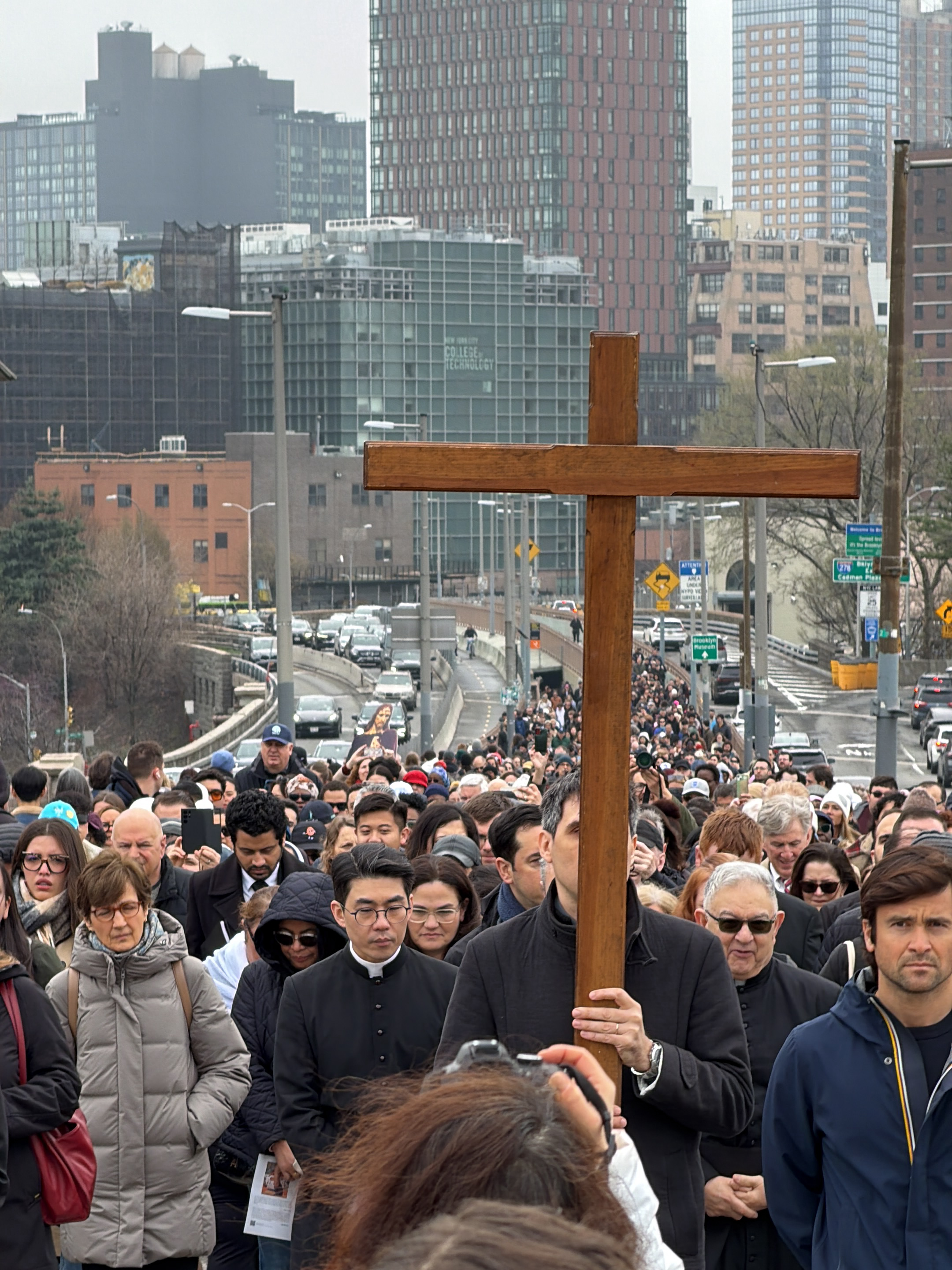 A procession of people walks along a bridge, with tall buildings in the background, likely in New York City, United States. The central focus is a large wooden cross carried by an individual. The proc…read more