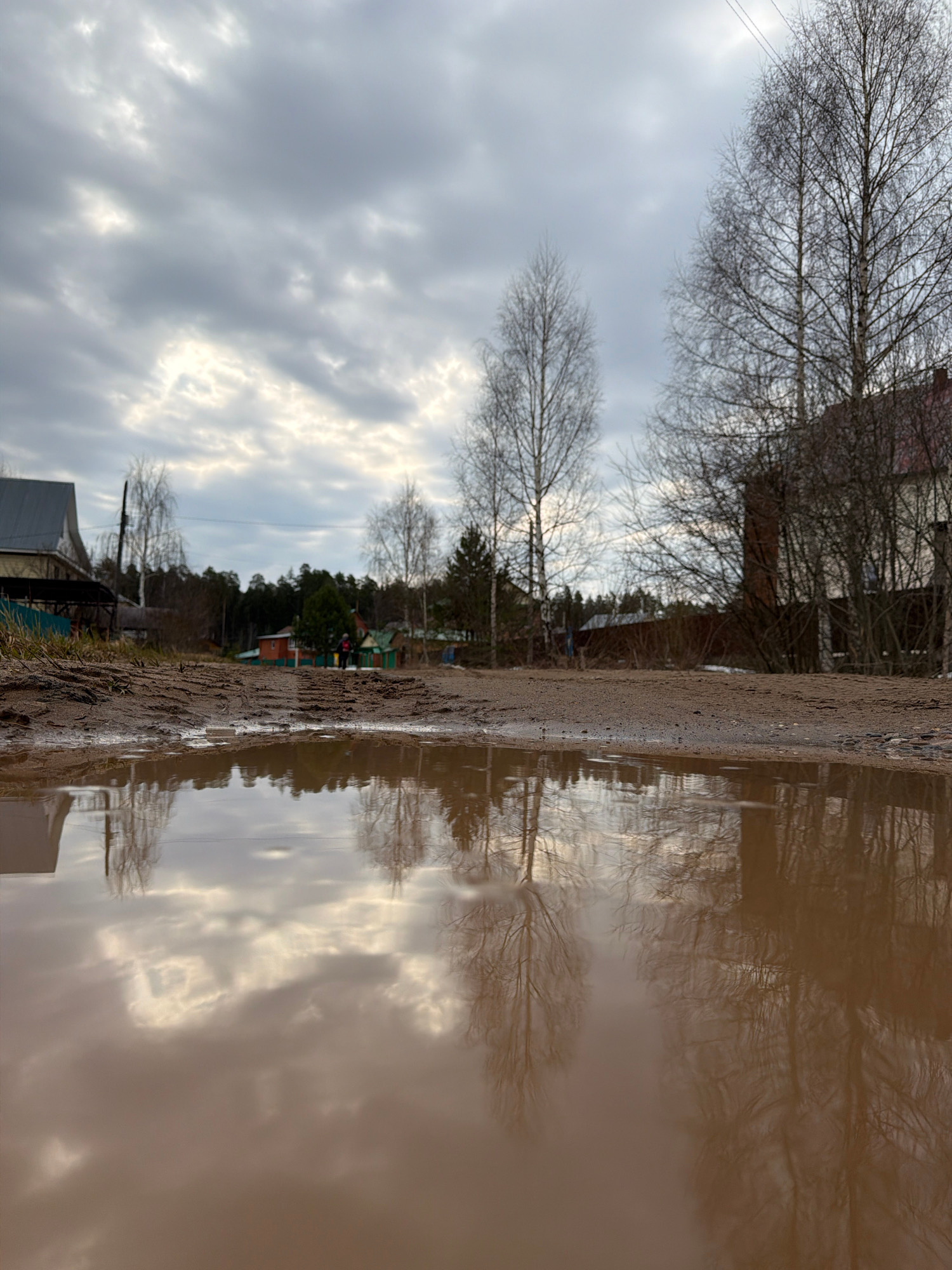 The image depicts a rural or semi-rural scene, possibly located in the city of Chaikovsky, Russia. A dirt road or path runs vertically through the center of the frame. To the left of the road is a mud…read more
