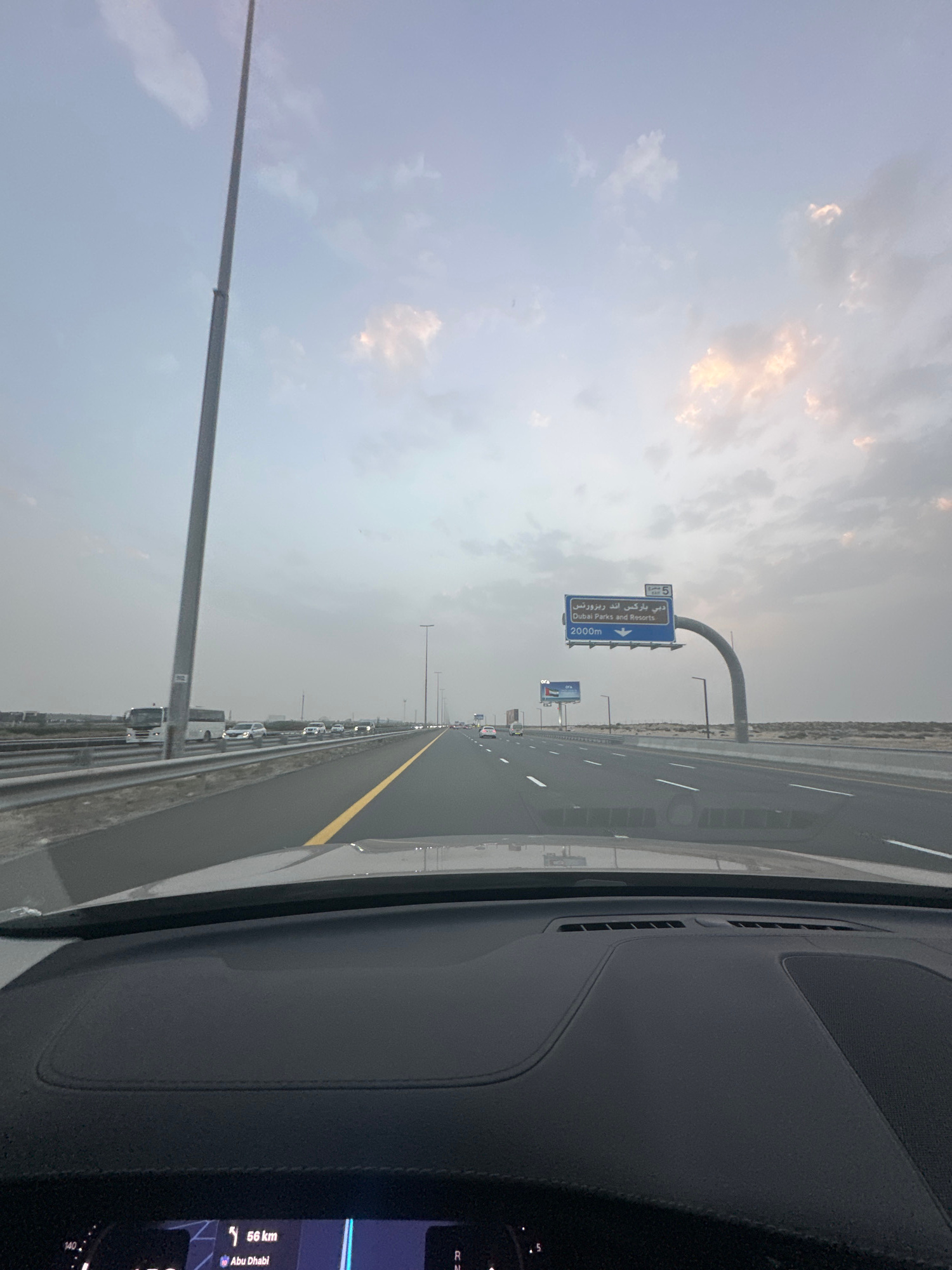 The image depicts a view from inside a car, likely on a highway in Dubai, United Arab Emirates. The dashboard is visible on the right side of the frame. On the highway, there is traffic, as well as si…read more