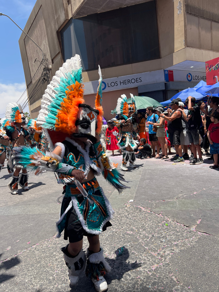 A street parade features costumed performers. A person in an elaborate Native American-inspired outfit with large orange and teal feathered wings and ornate fur-trimmed footwear is in the foreground.…read more