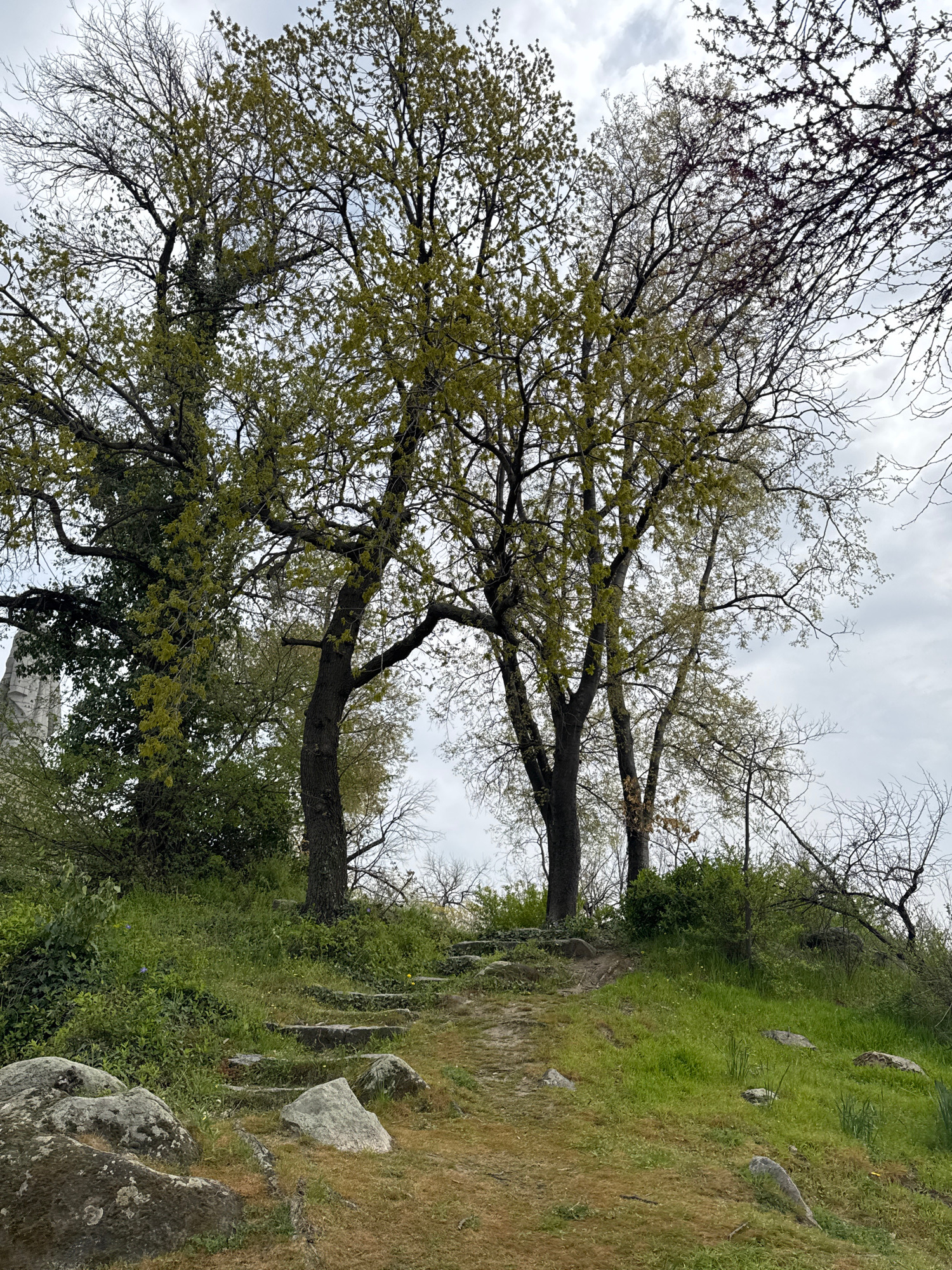 The image depicts a park scene in Plovdiv, Bulgaria, characterized by a walking path traversing a grassy, slightly elevated area. The path is constructed with stone steps. Two mature trees dominate thβ¦read more