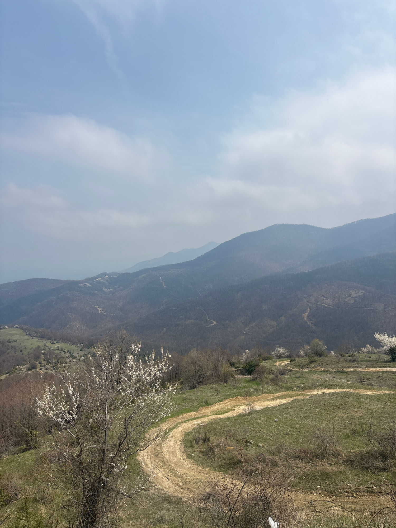 The image depicts a landscape scene in Oreshets, Bulgaria. The right side features a hillside with a dirt road winding through the grassy terrain. Bare trees and flowering bushes dot the slope. In the…read more