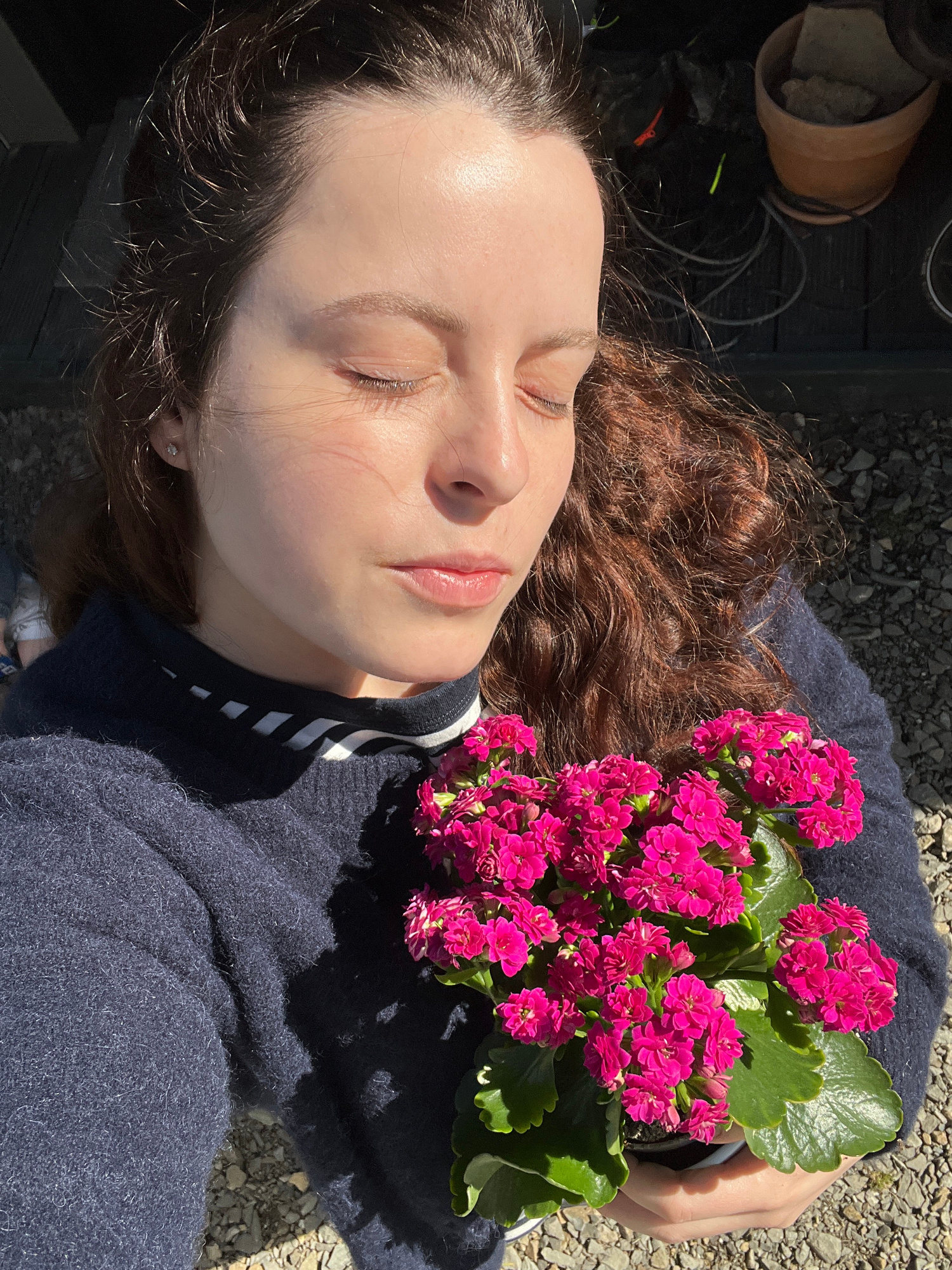 A young, light-skinned person with closed eyes lies outdoors, with her head resting against a navy blue sweater with a white-striped collar. She has auburn, curly hair. Her left cheek is visible, with…read more