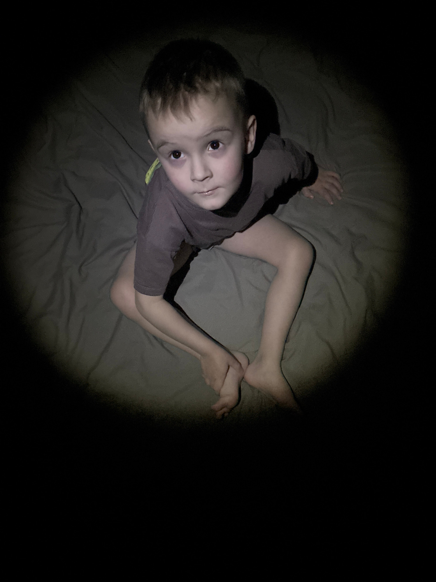 A child wearing a brown, short-sleeved shirt is sitting on a grey bedsheet. The child's head is facing the camera with a slight upward gaze. The child's legs are bent at the knees and drawn up to the…read more