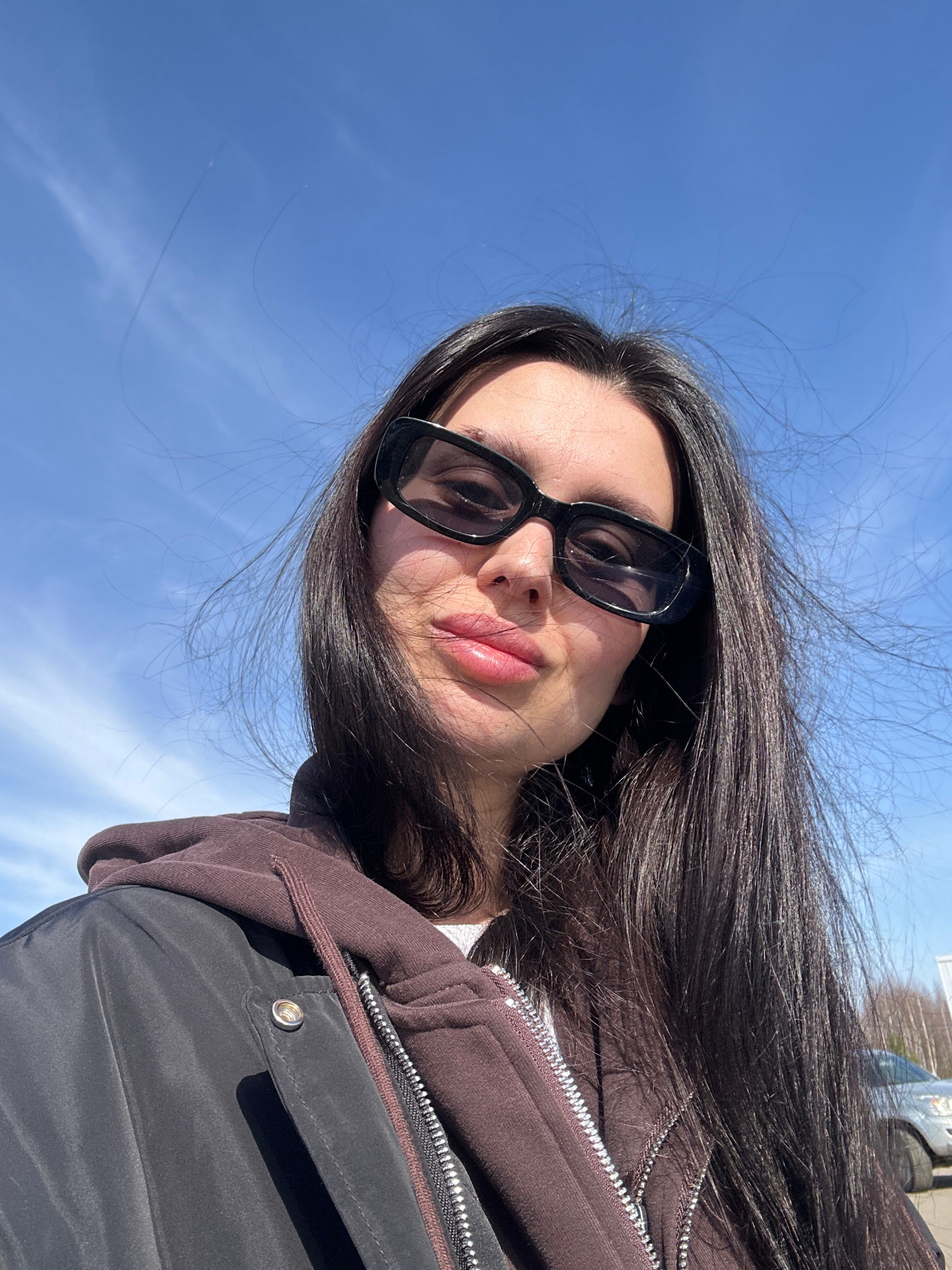 A woman with long dark hair and sunglasses is posing for a selfie outdoors. She is wearing a brown hoodie and a black jacket. The background shows a blue sky with some faint clouds. The location is no…read more