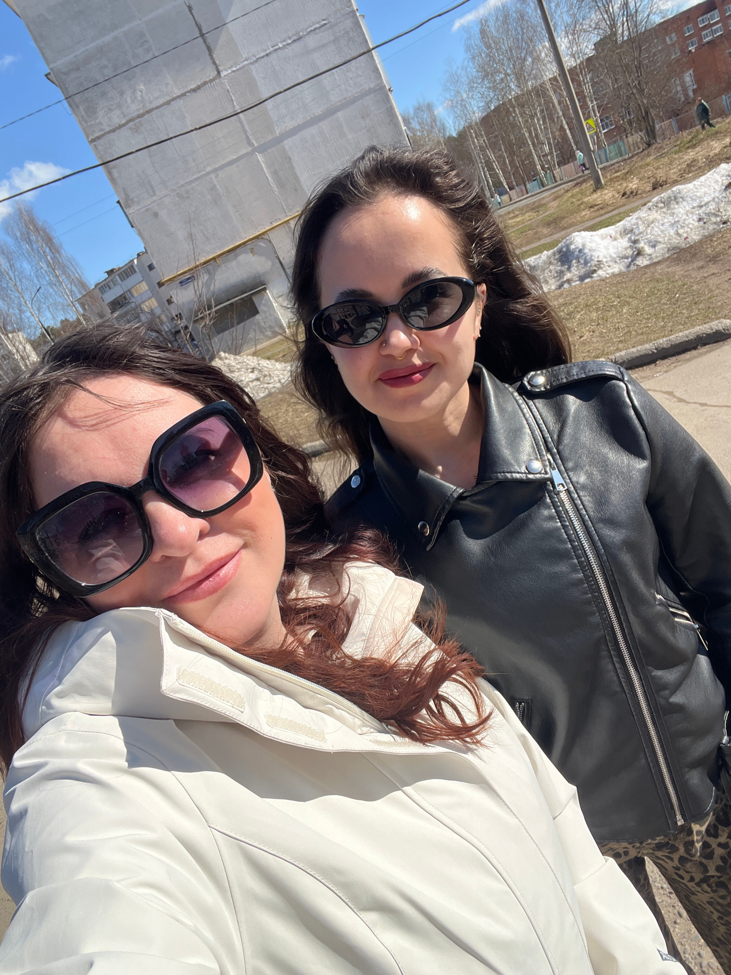 Two women are pictured in an outdoor setting, likely on a sidewalk in Noviy, Russia. The woman at the top wears a black leather jacket and dark sunglasses. The woman below her wears a white jacket and…read more