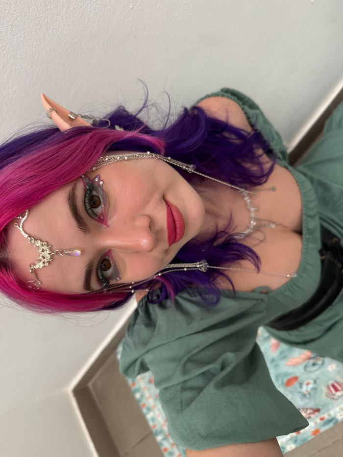 A woman with pink and purple hair, pointed elf ears, and decorative jewelry poses for the camera. She wears a light green top with a dark belt. Her makeup includes winged eyeliner and a gem on her for…read more