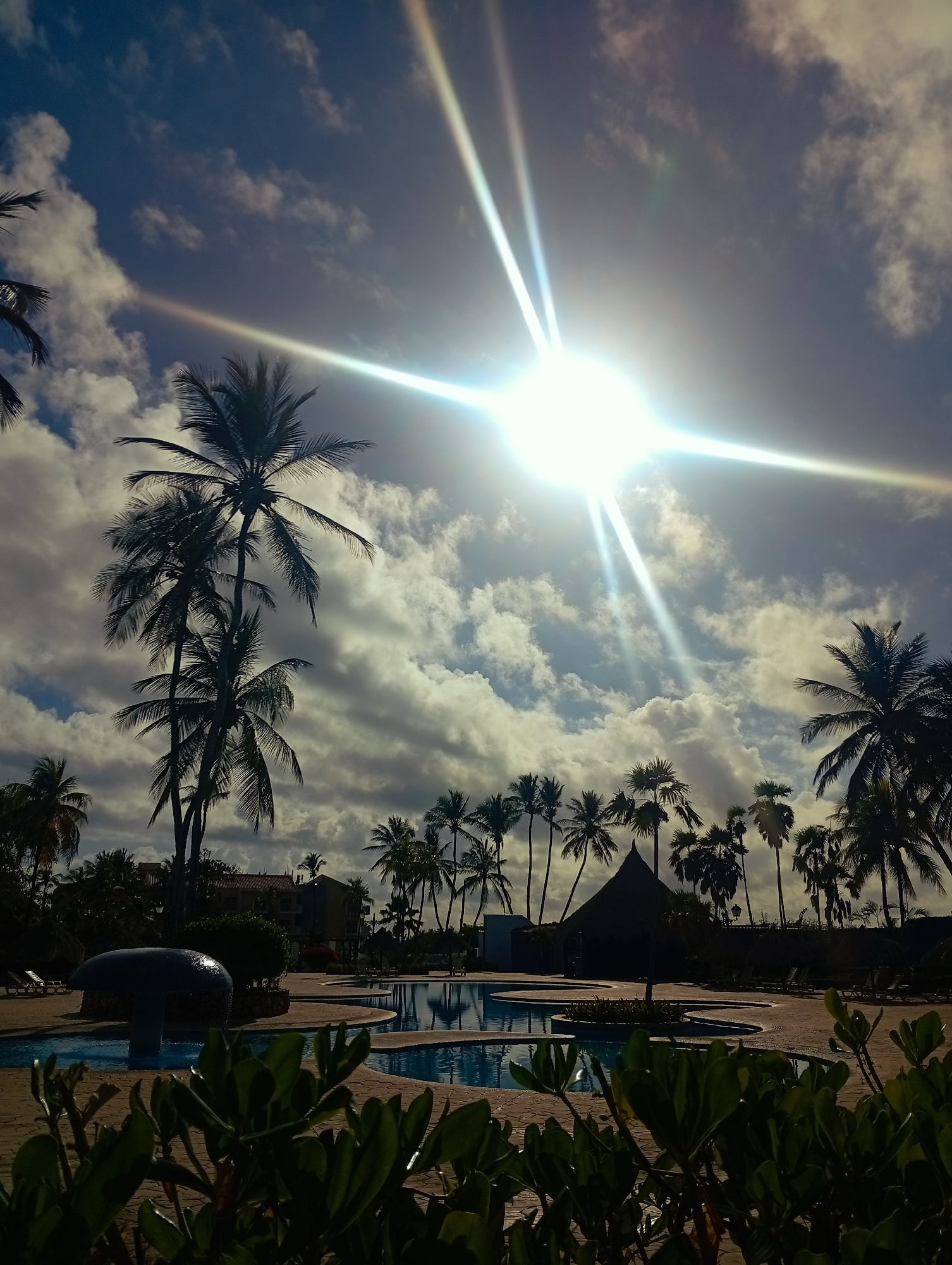 This image depicts an outdoor resort area in Playa El Agua, Venezuela. The scene is illuminated by strong sunlight originating from the upper right, producing prominent lens flares across a partly clo…read more