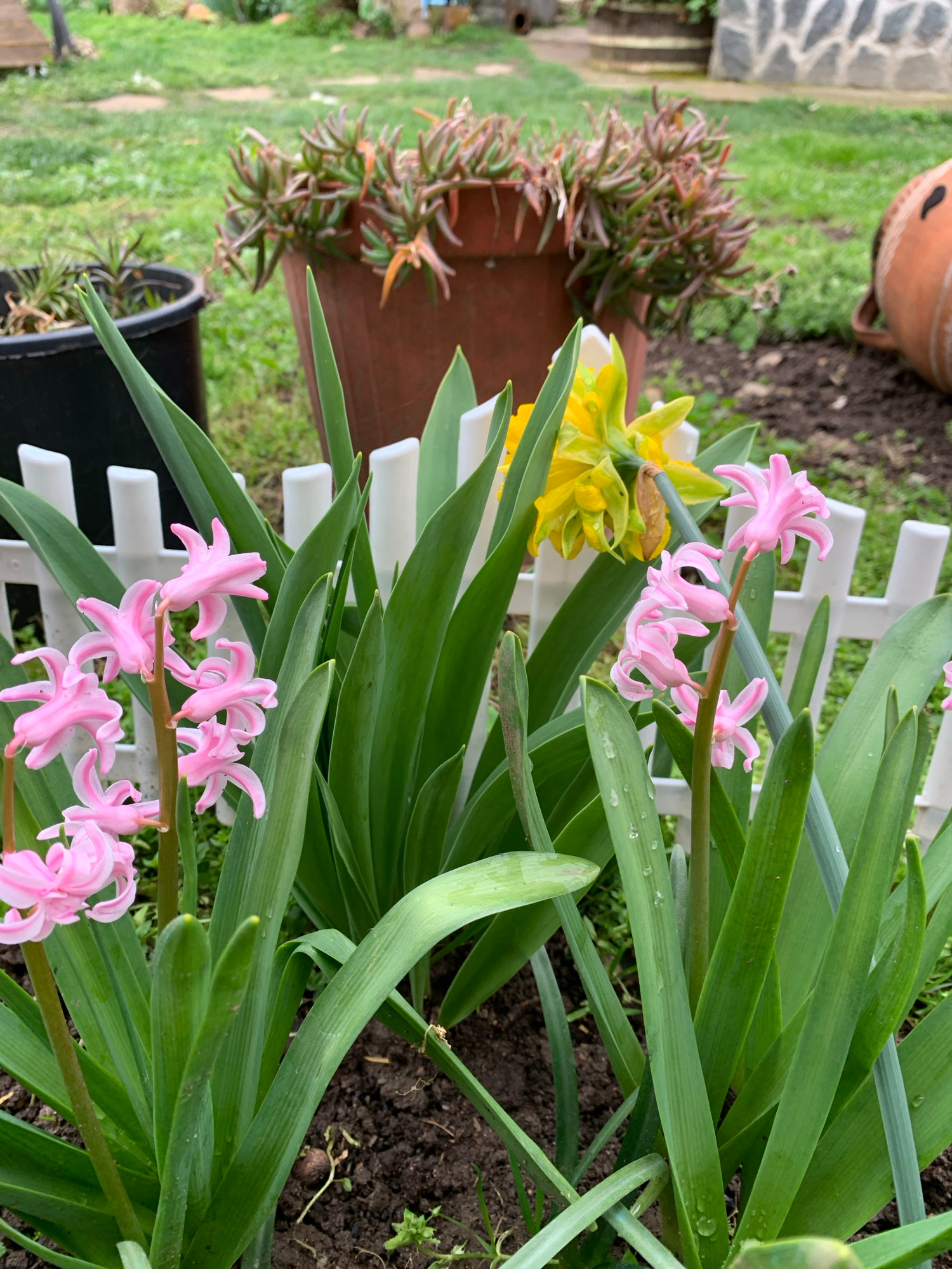 The image shows a garden scene, likely in Lehchevo, Bulgaria. Two pink hyacinths and a yellow daffodil are prominently displayed against a white picket fence. Green foliage surrounds the flowers. A te…read more