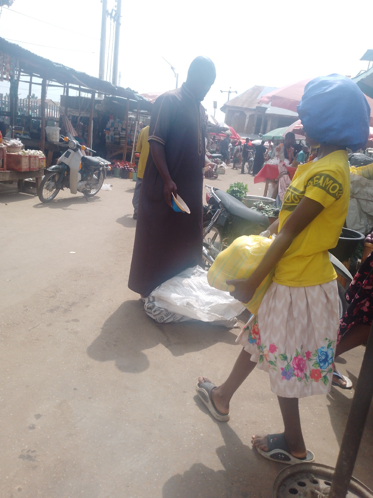 In an outdoor market in an urban setting, a person wearing a long brown robe stands next to a large white bag. A child in a yellow t-shirt and floral skirt carries a yellow bag. A motorcycle is parked…read more