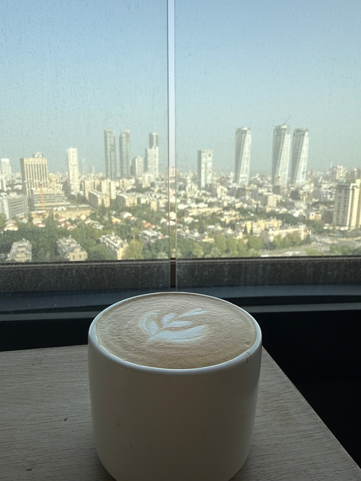 A cityscape, likely Tel Aviv, Occupied Palestine, is visible through a window. The buildings are densely packed, with a mix of high-rises and lower structures. There appears to be vegetation intersper…read more