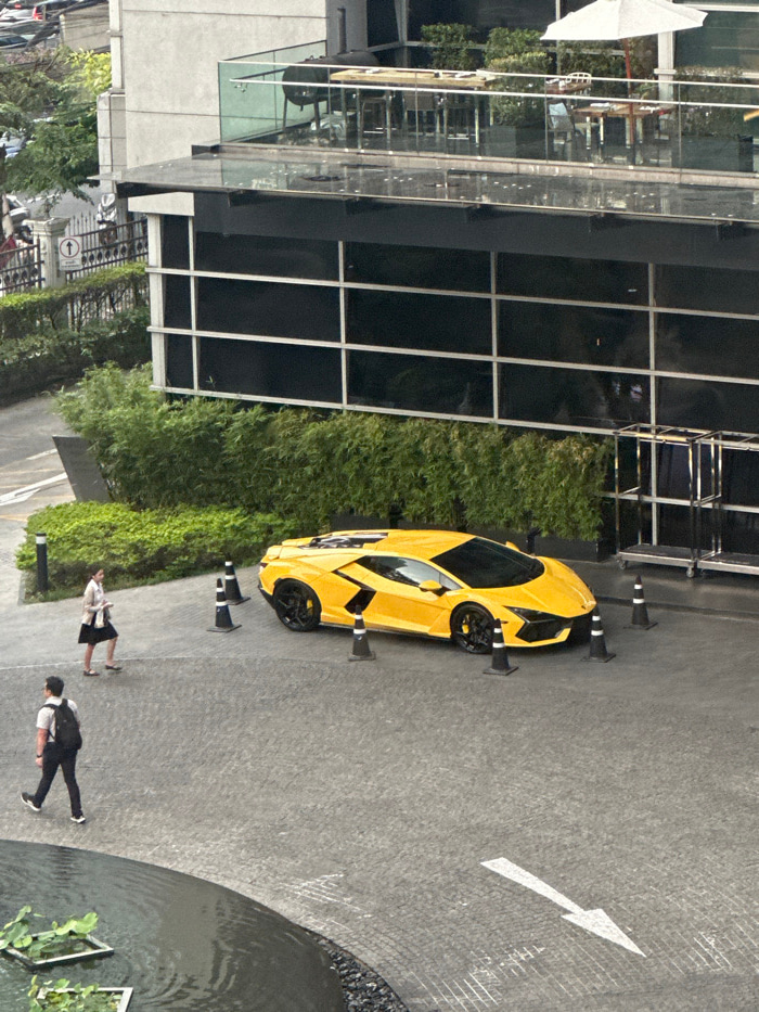 A yellow Lamborghini is parked among traffic cones in front of a modern building with large windows. The building is partially obscured by greenery. Two people are walking on the cobblestone pavement…read more