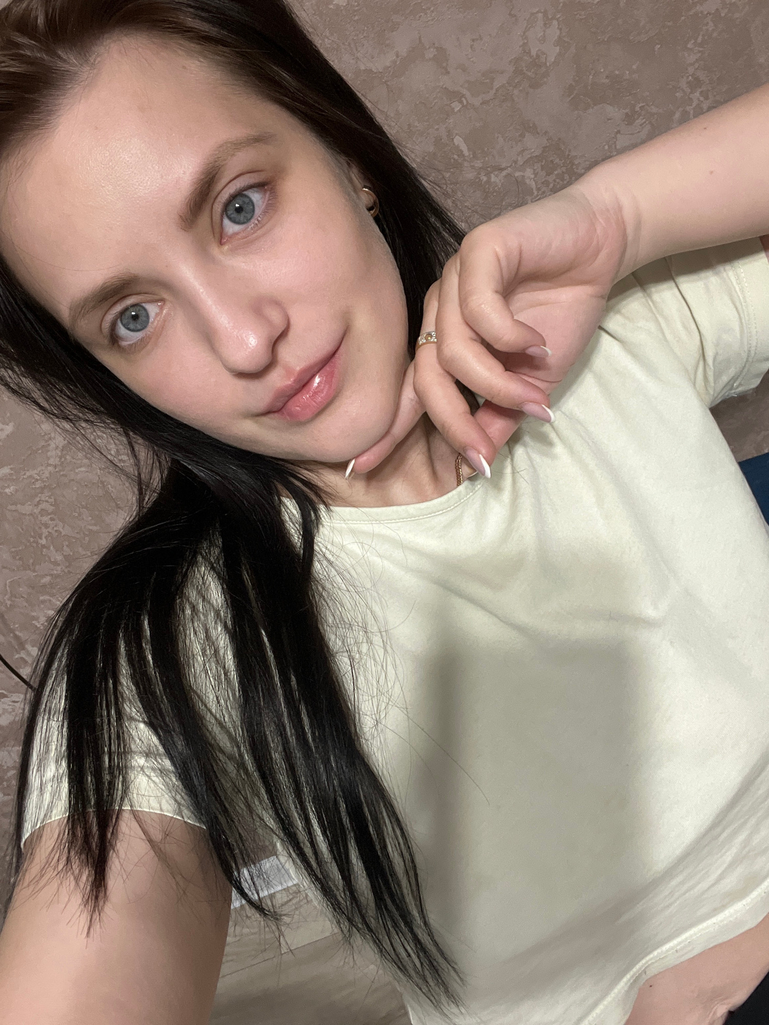 The image depicts a woman with dark hair and light eyes lying down. Her head is tilted, and she is looking directly at the camera. She is wearing a light-colored T-shirt. Her right hand is near her fa…read more