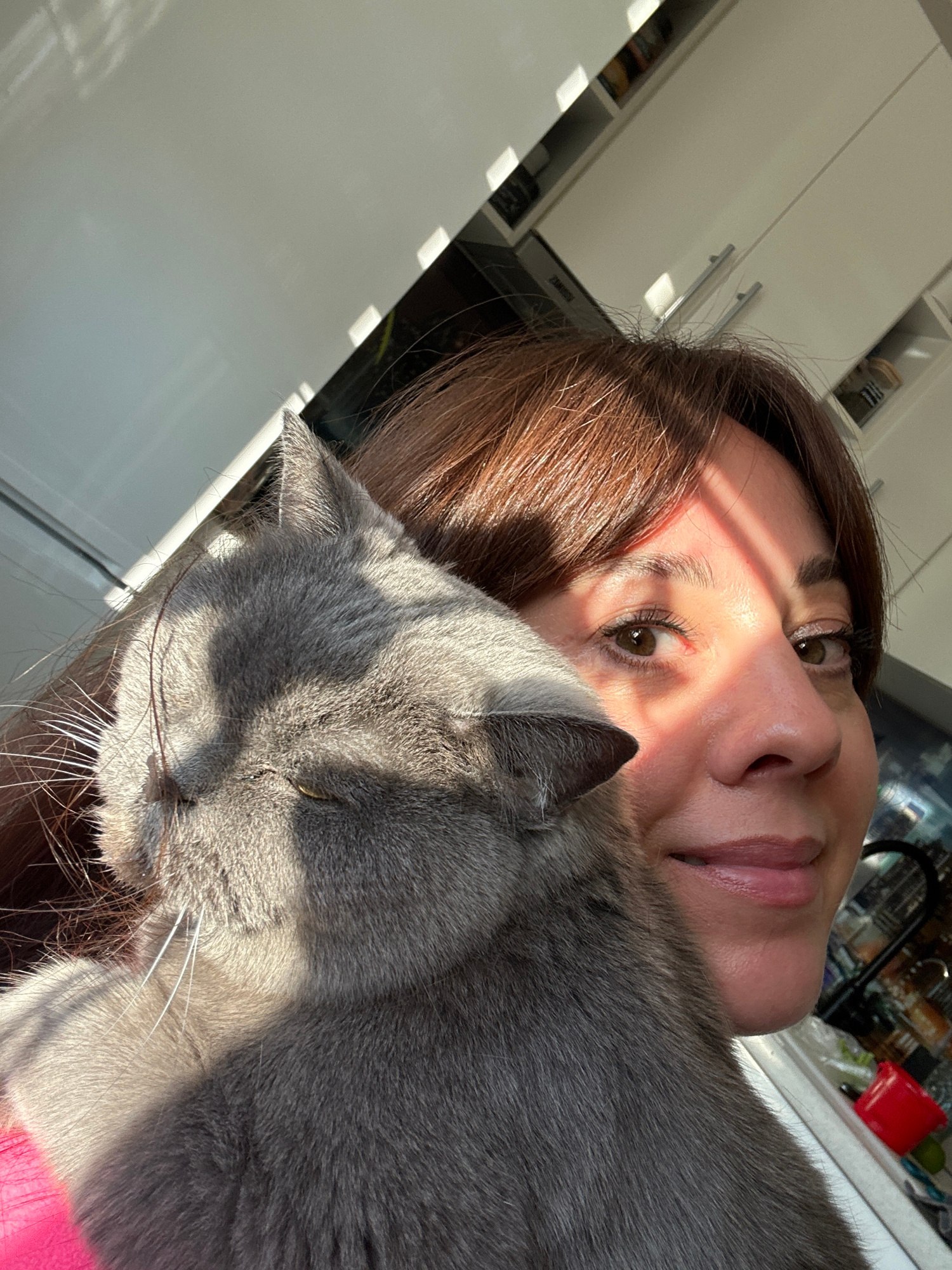 The image depicts a person in a selfie with a gray cat. The person has light skin, brown hair, and brown eyes. The cat appears to be a British Shorthair or similar breed, with short, dense gray fur. T…read more