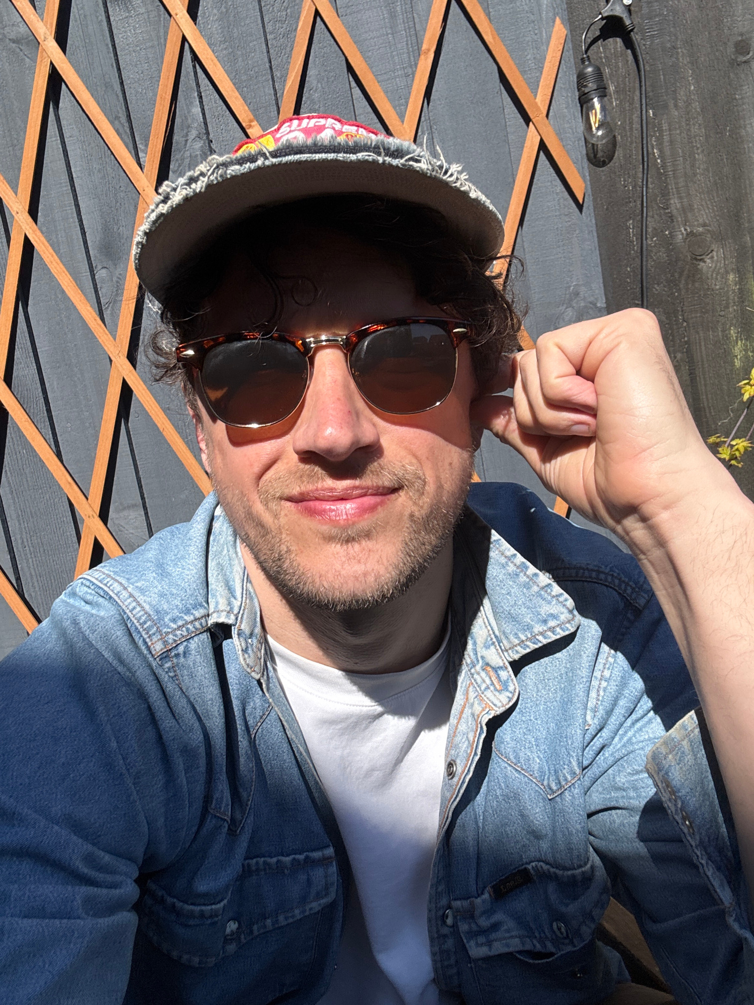A person is shown from the waist up, wearing a white t-shirt and denim jacket, with sunglasses and a brimmed hat. They are positioned on an outdoor, wooden, gray-painted structure, with tan-colored la…read more