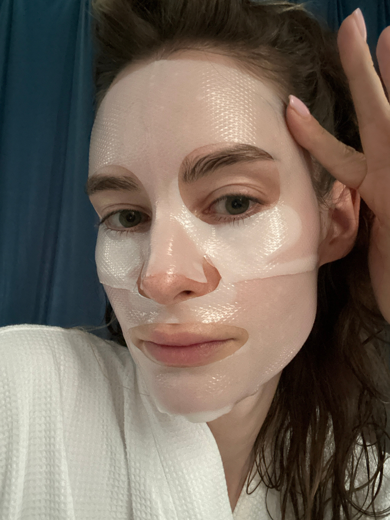 A female individual is depicted in a close-up, chest-up shot within an indoor setting in Choeng Thale, Thailand. She is wearing a white, textured sheet mask that covers her forehead, cheeks, and chin,…read more
