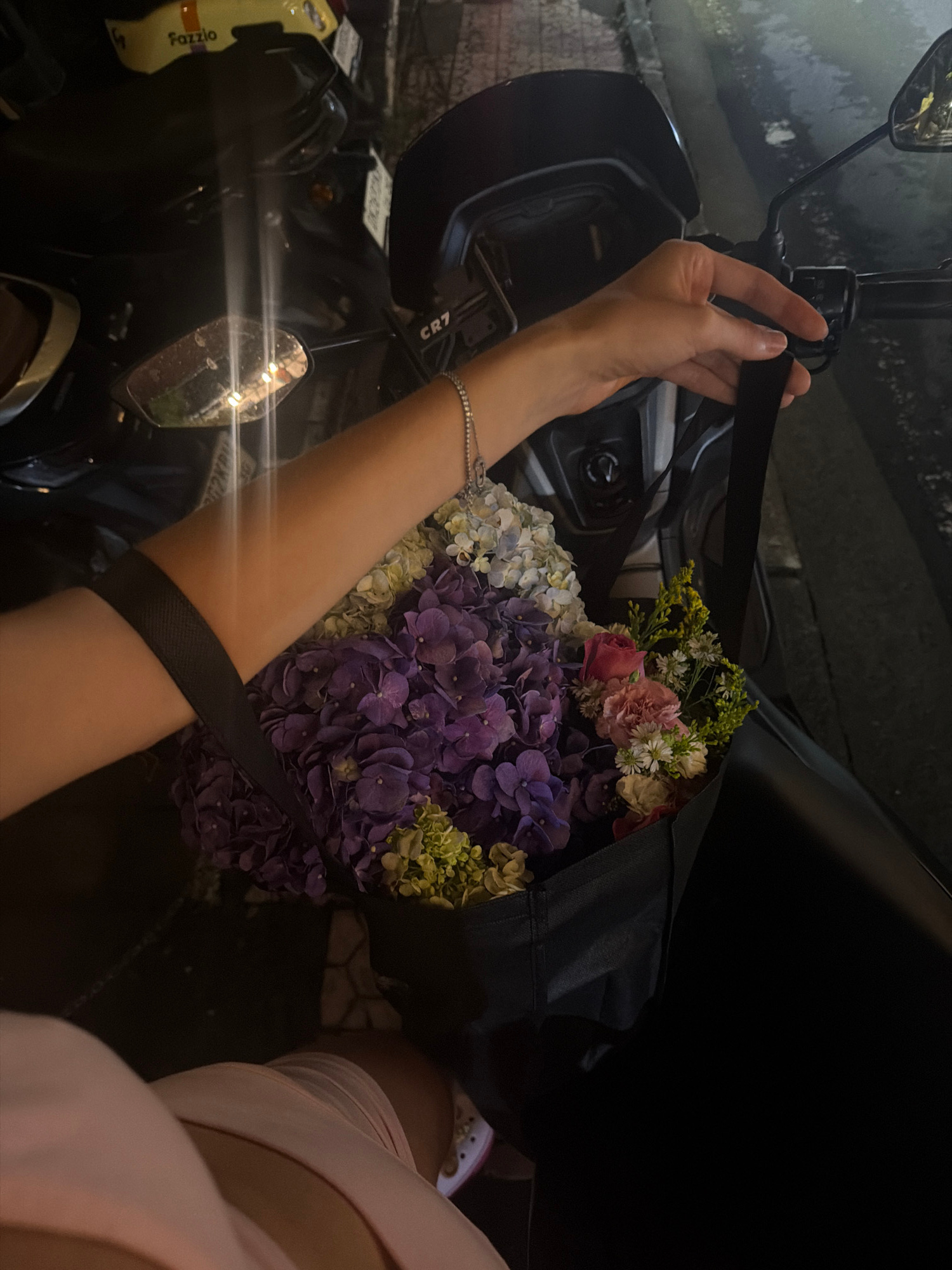 A person is securing a bouquet of flowers to a motorcycle in what appears to be Ubud, Indonesia. The bouquet is a mix of hydrangeas, roses, and other smaller flowers, wrapped in black fabric. The pers…read more