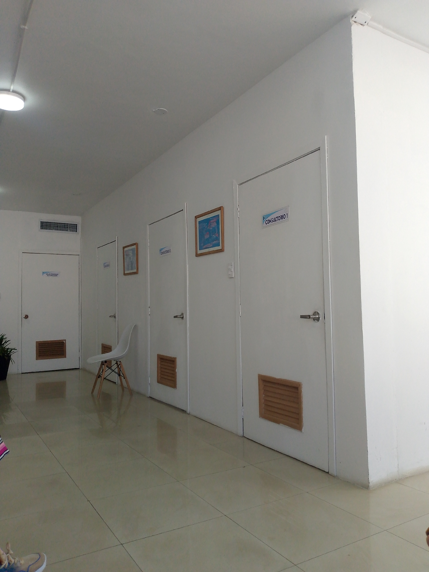 The image depicts an interior hallway, likely in a medical or office building in Machala, Ecuador. The floors are tiled and shiny. There are four white doors along the right side of the hallway, each…read more
